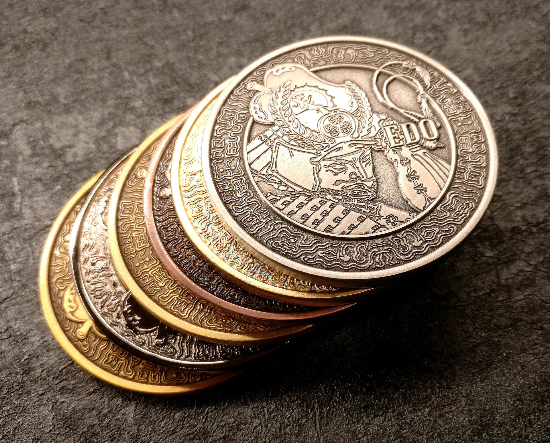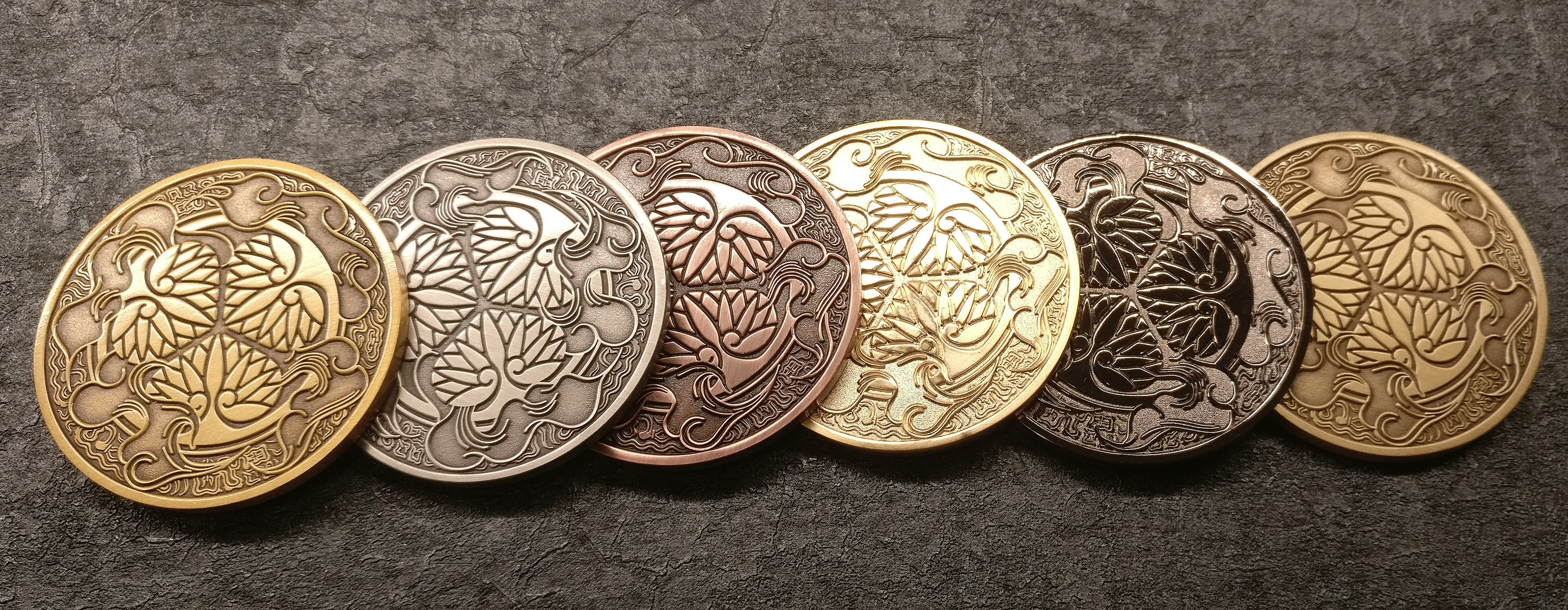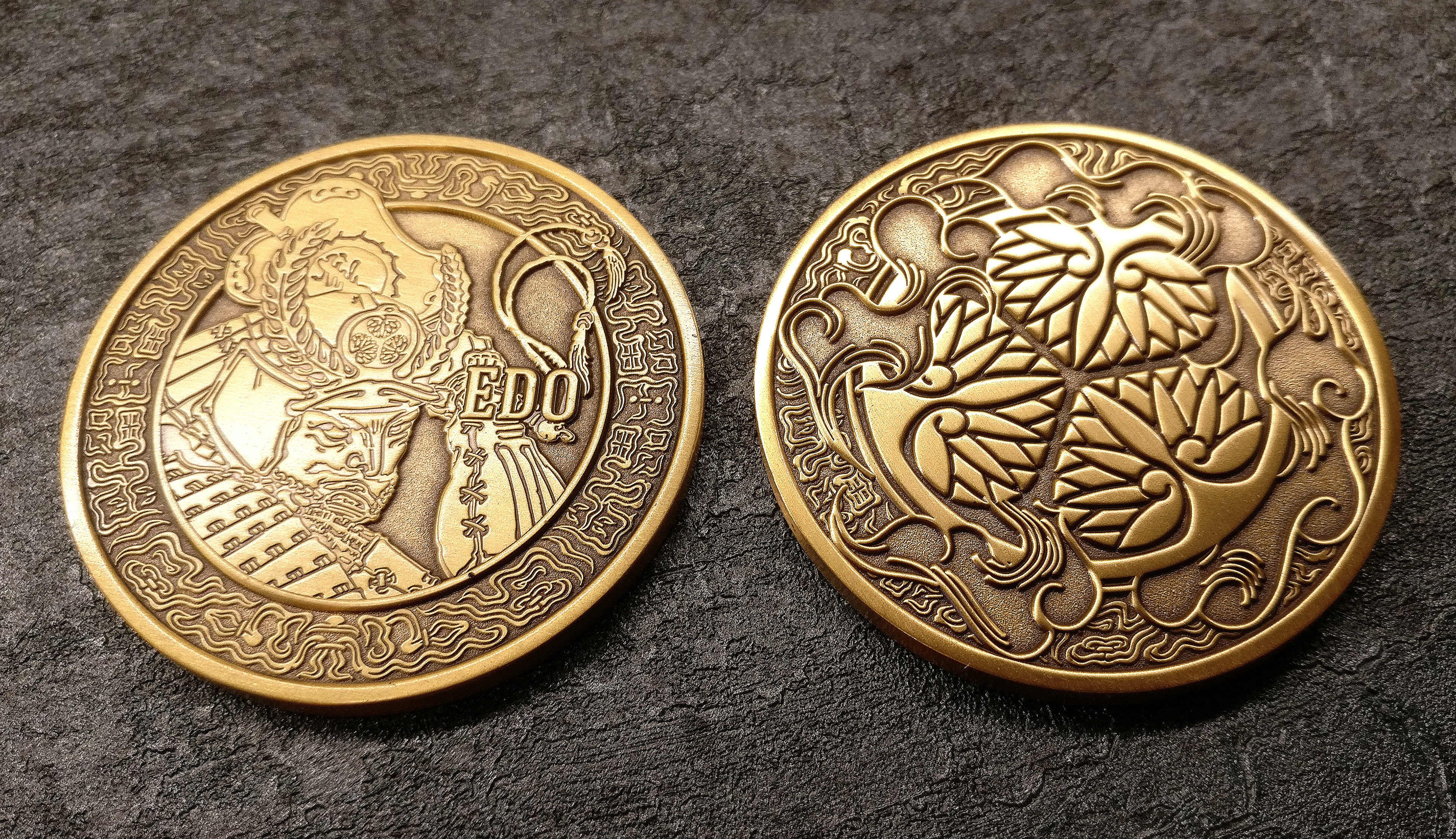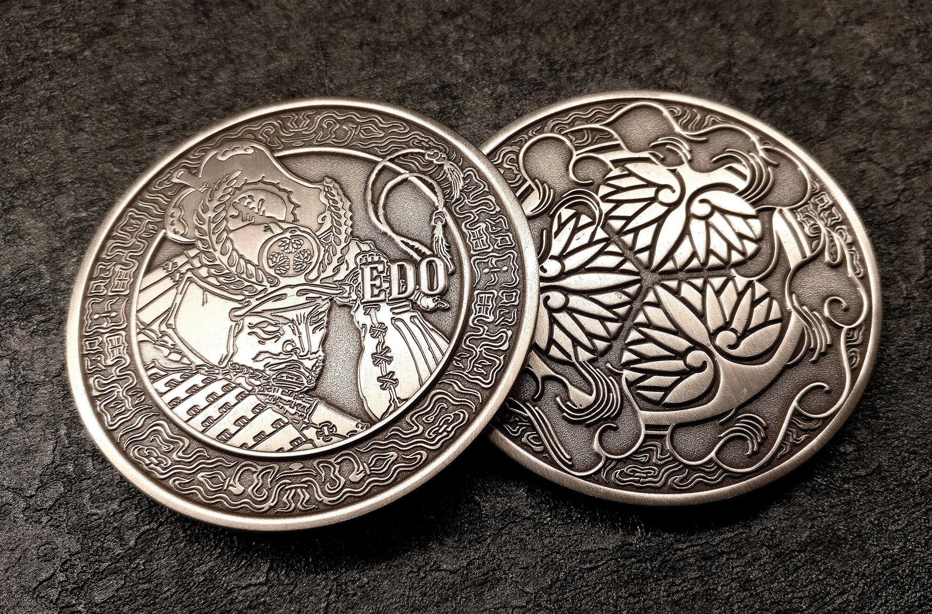 A custom coin was also created to complement the world of Edo Karuta. The obverse features Tokugawa Ieyasu, while the reverse bears the hollyhock crest — the family mon of the Tokugawa clan. A fitting collector's piece to accompany the deck.