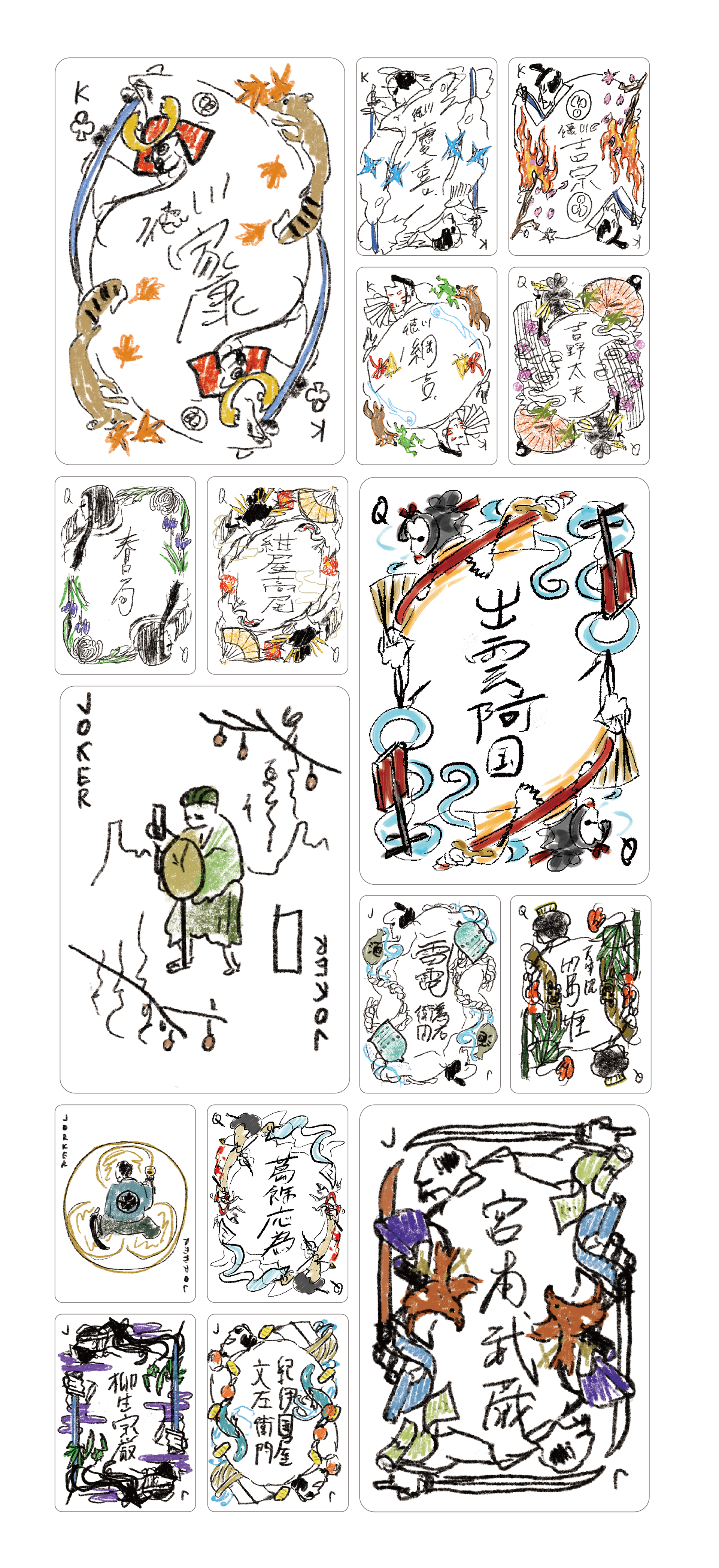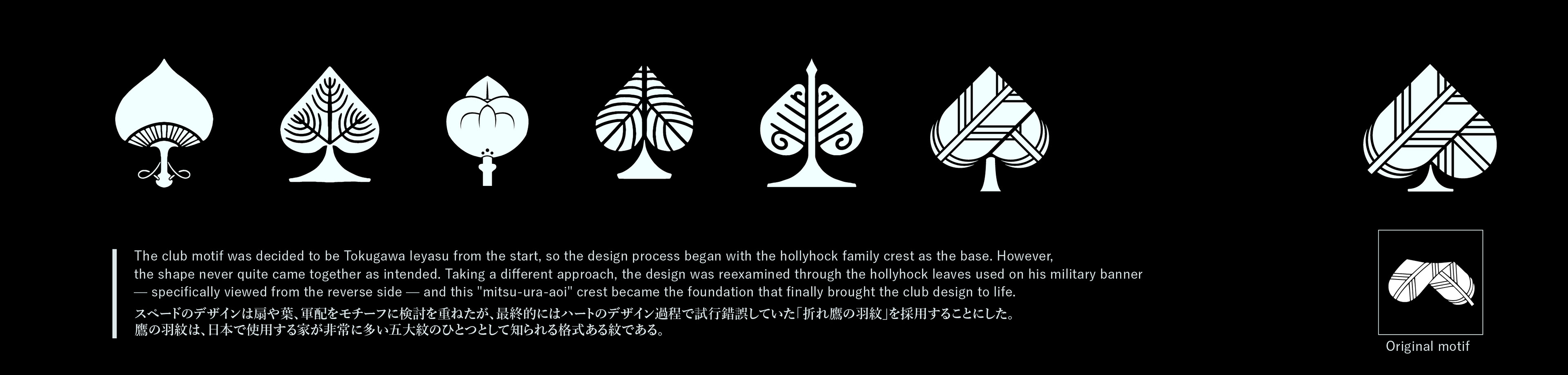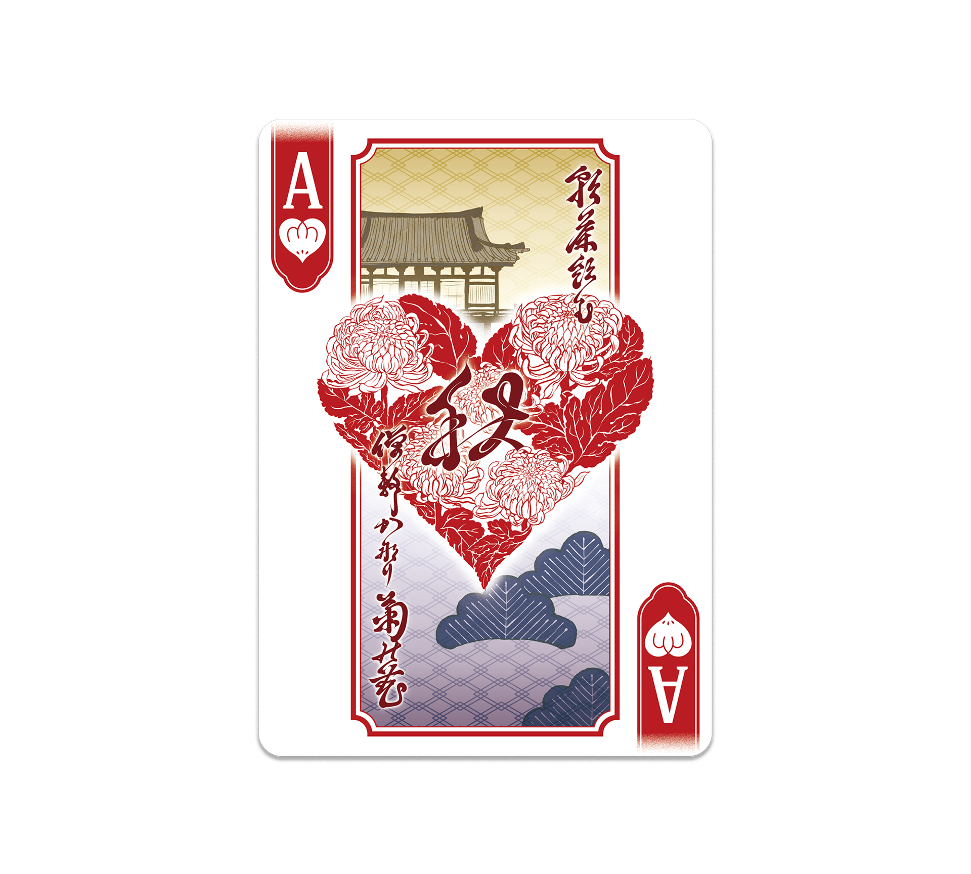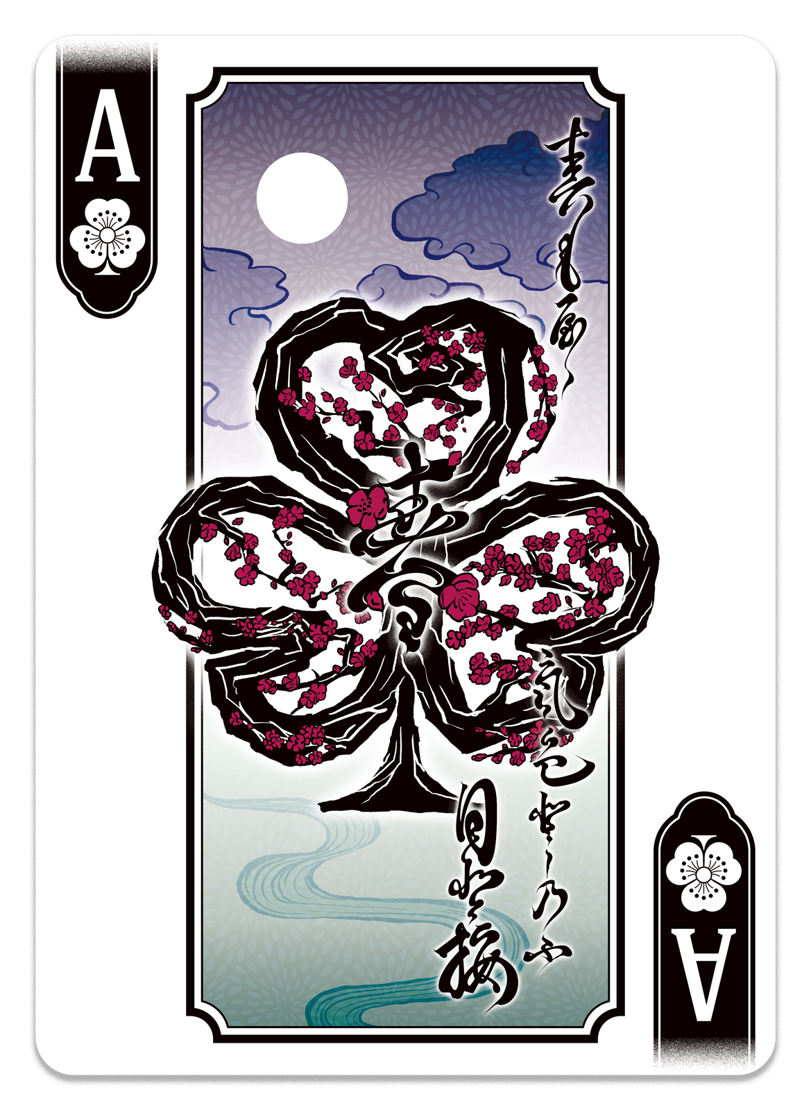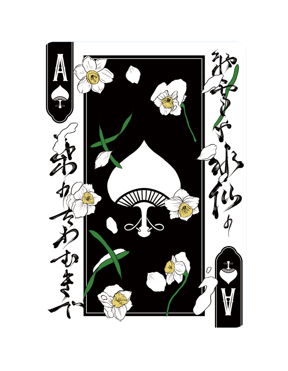各Aには、季節の歌と花を添えました。いずれも、このデッキのJOKERである松尾芭蕉が詠んだ句です。このトランプの世界観はすべて、彼が見た景色と、彼が伝えようとした事象によって紡がれています。