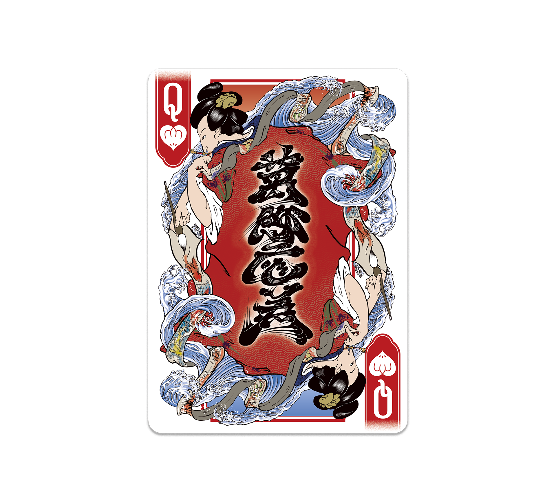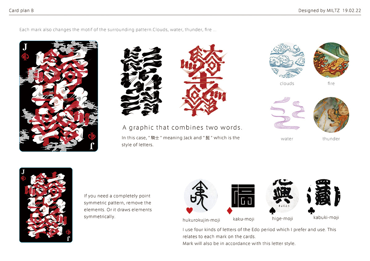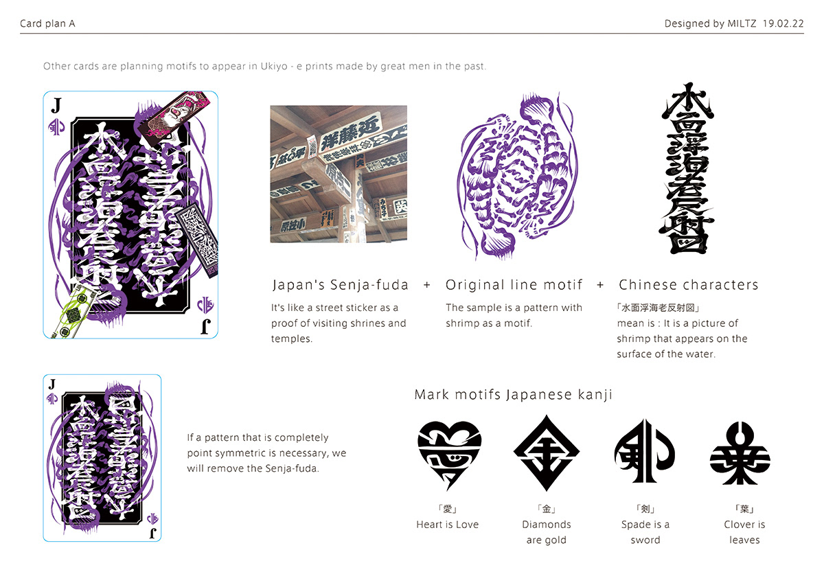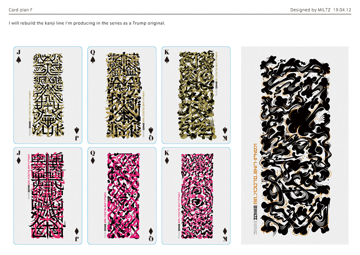 In the early stages of conception, my thinking gravitated naturally toward lettering art — the discipline that forms the very core of my practice. As I explored the history of playing cards and the symbolic weight embedded within each suit, I began to find organic points of convergence with the cultural soil of Japan. This recognition crystallised into the first concept: elevating lettering into the visual language of tattooing, adorning historical figures with its intricate forms. Through the process of making, however, the concept underwent an organic transformation — ultimately arriving at the form it takes today.