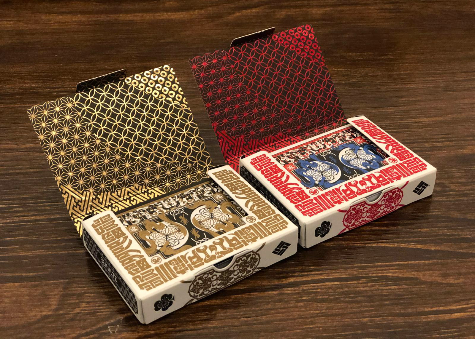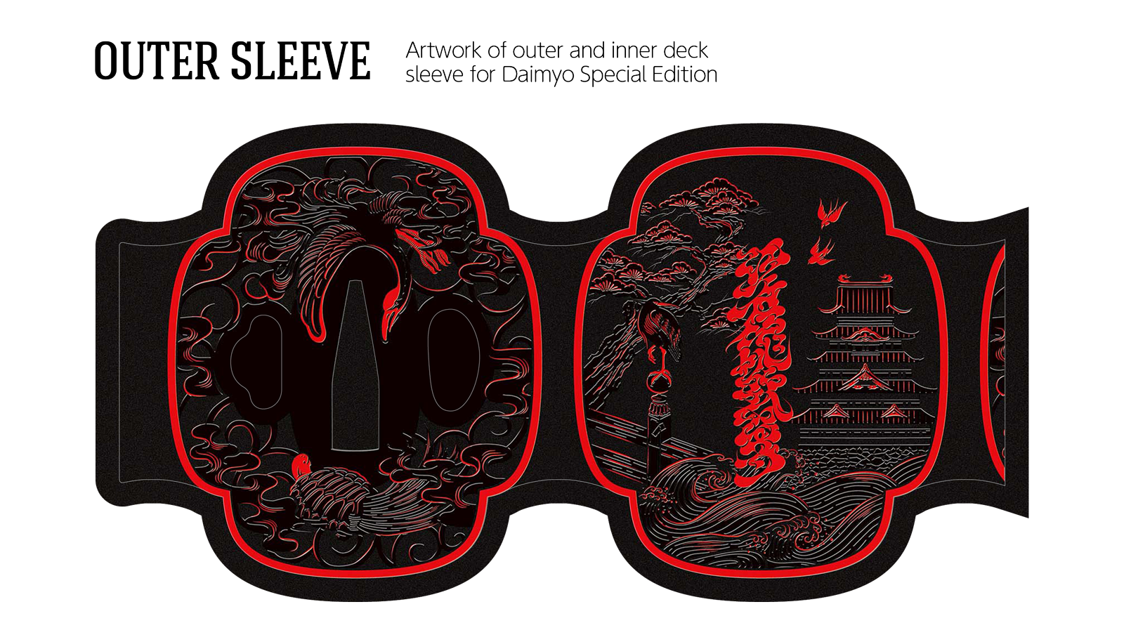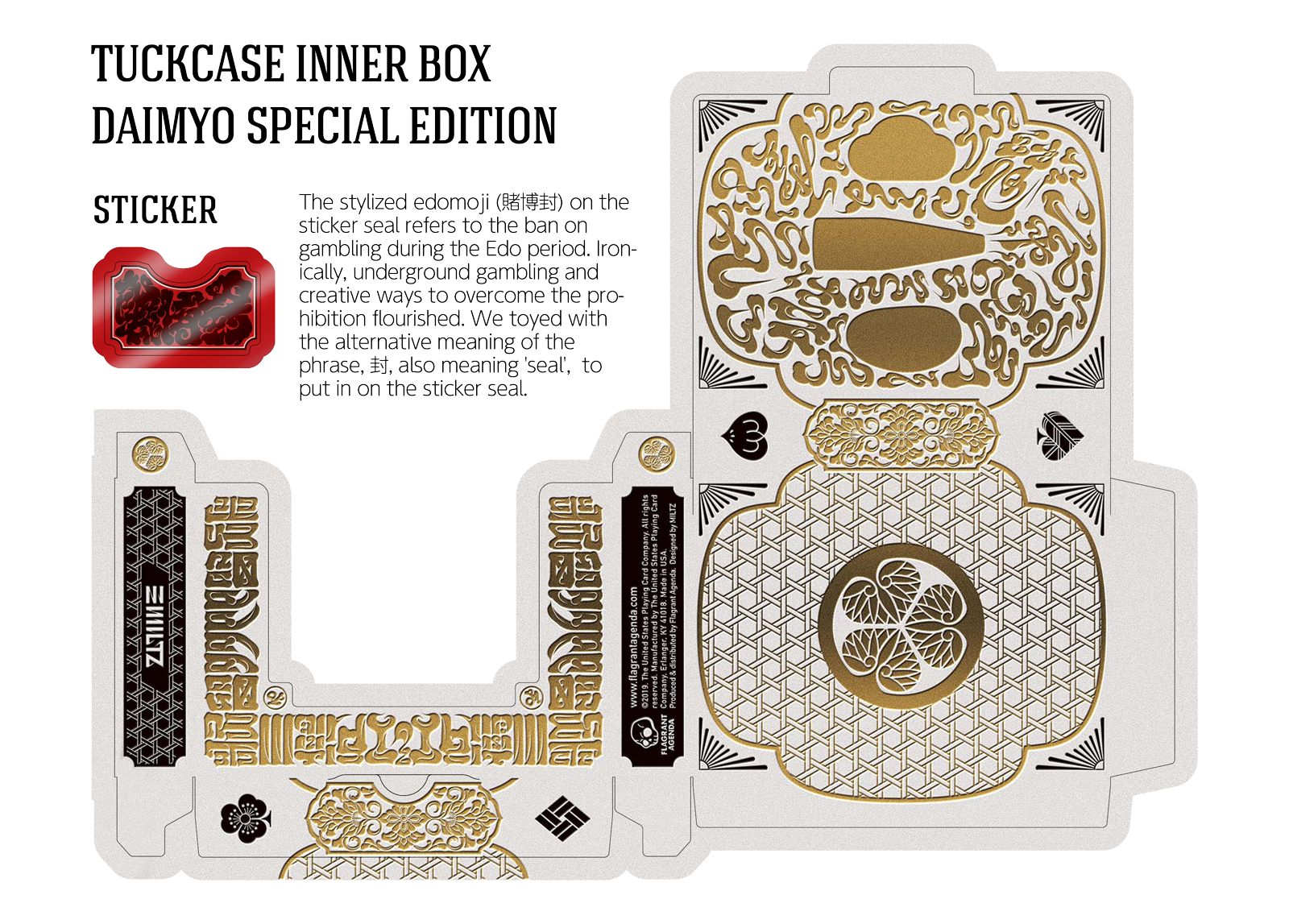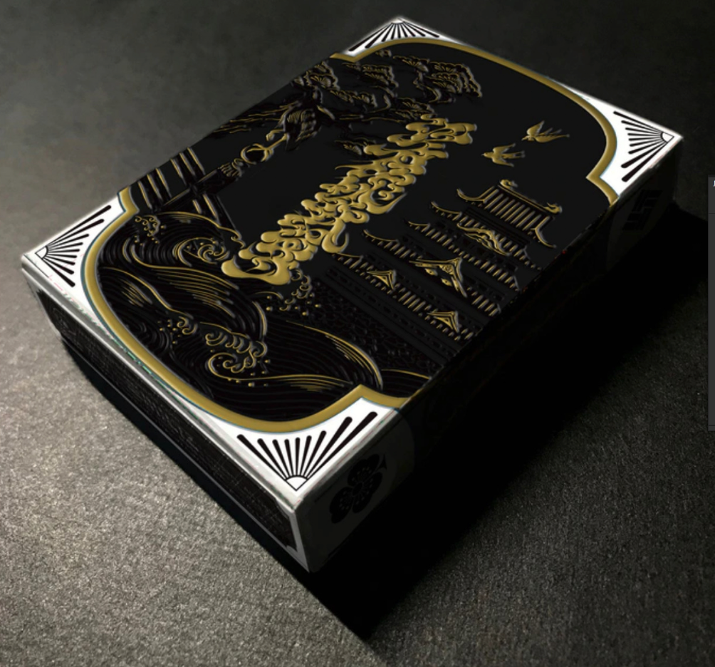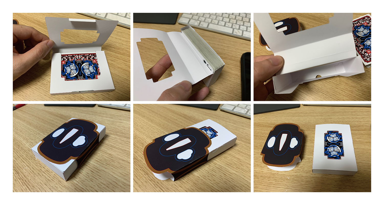 The Special Edition of both the Daimyo and Shogun decks includes a custom tuck case and deck sleeve. Since Edo Karuta's artwork covers every surface of the deck, the packaging has been redesigned to reveal the inner artwork without compromising its structural integrity. The tuck case opens from the front, with the middle section hollowed out to expose the card backs upon opening. As the cards are removed, the full inner artwork of the tuck case is gradually revealed.