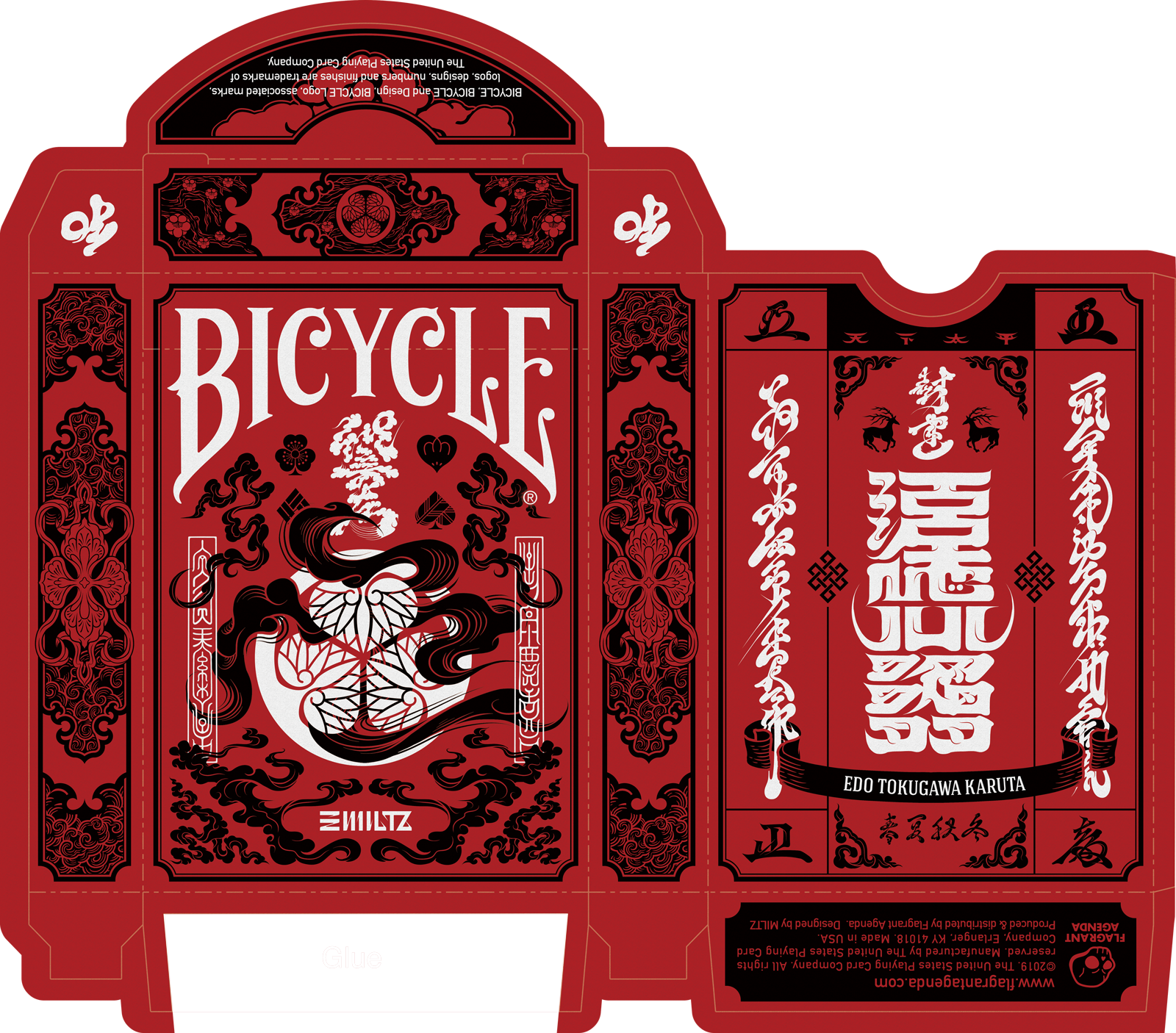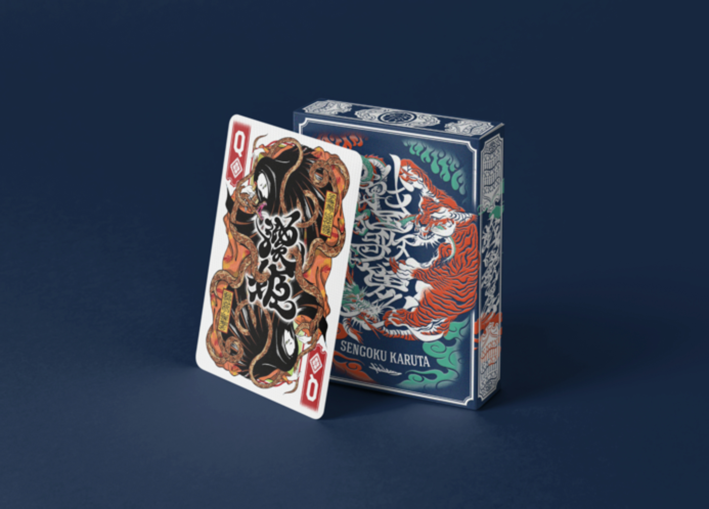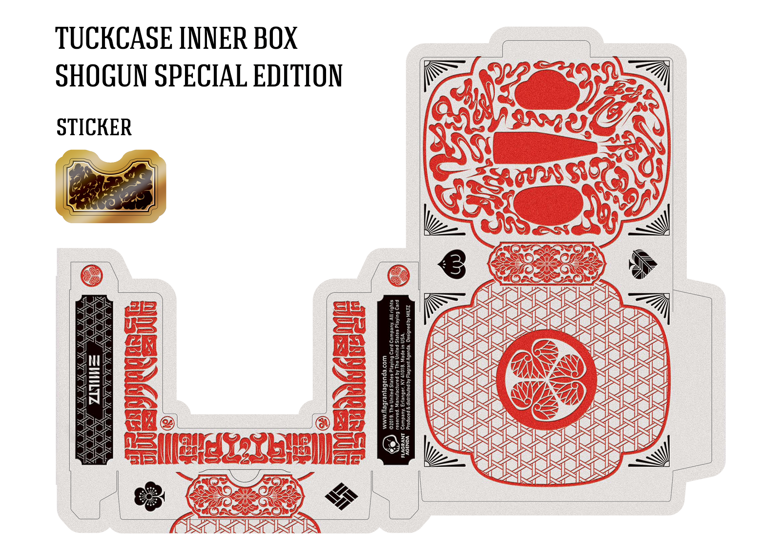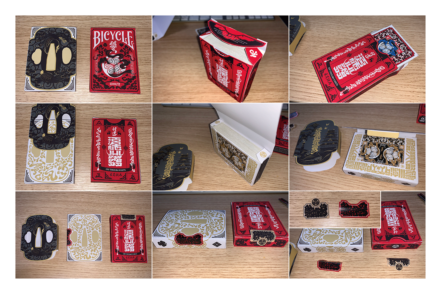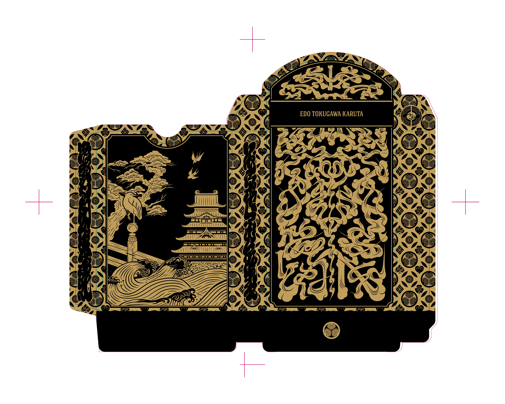 The Special Edition of both the Daimyo and Shogun decks includes a custom tuck case and deck sleeve. Since Edo Karuta's artwork covers every surface of the deck, the packaging has been redesigned to reveal the inner artwork without compromising its structural integrity. The tuck case opens from the front, with the middle section hollowed out to expose the card backs upon opening. As the cards are removed, the full inner artwork of the tuck case is gradually revealed.