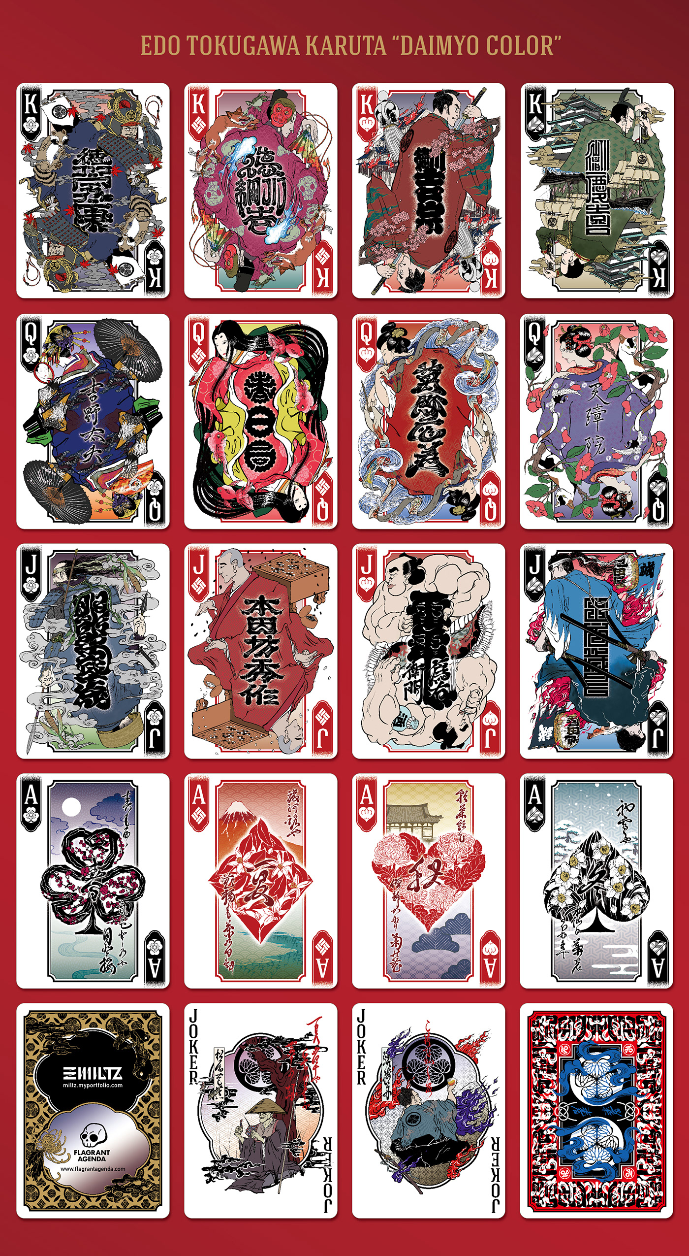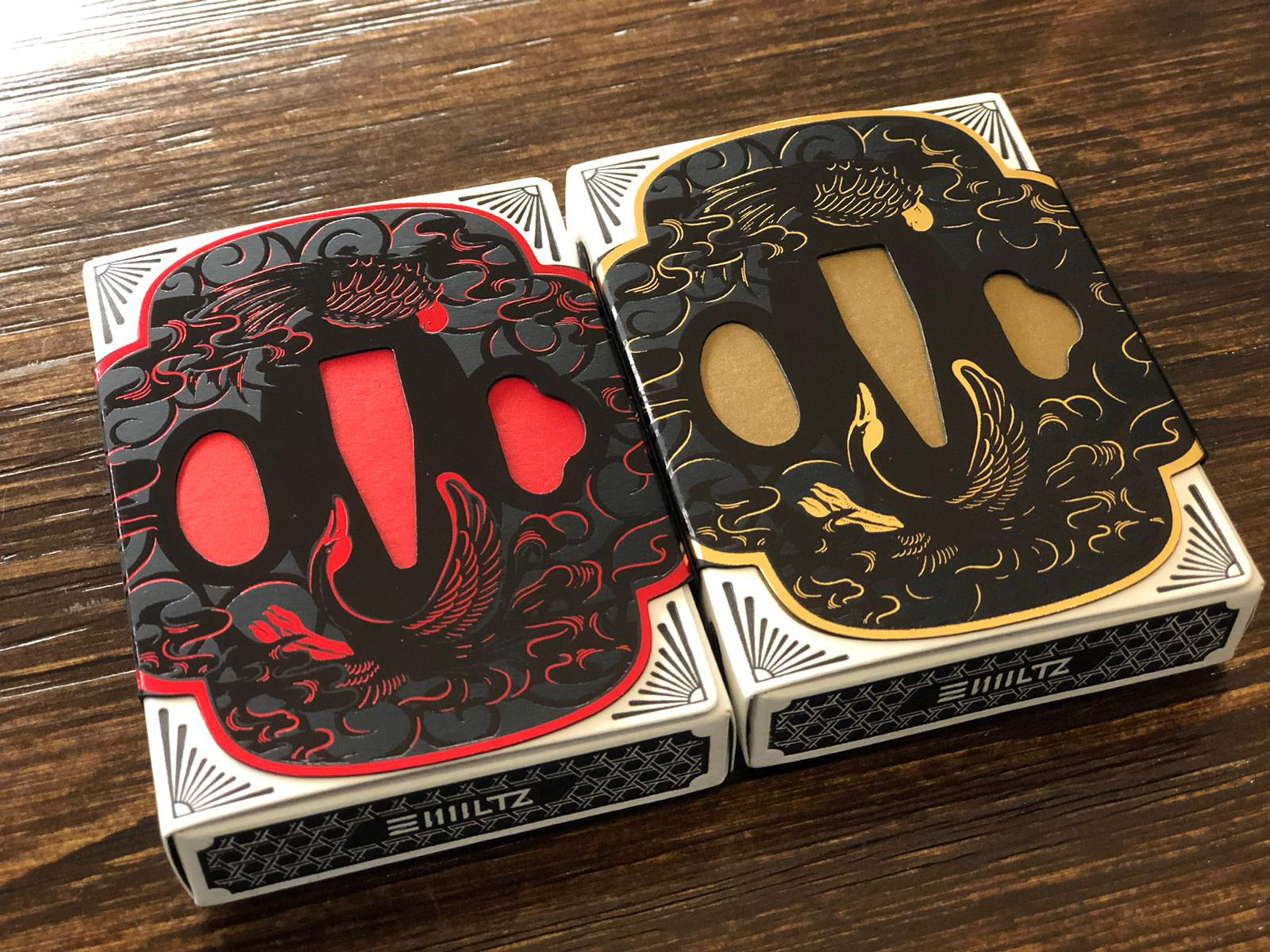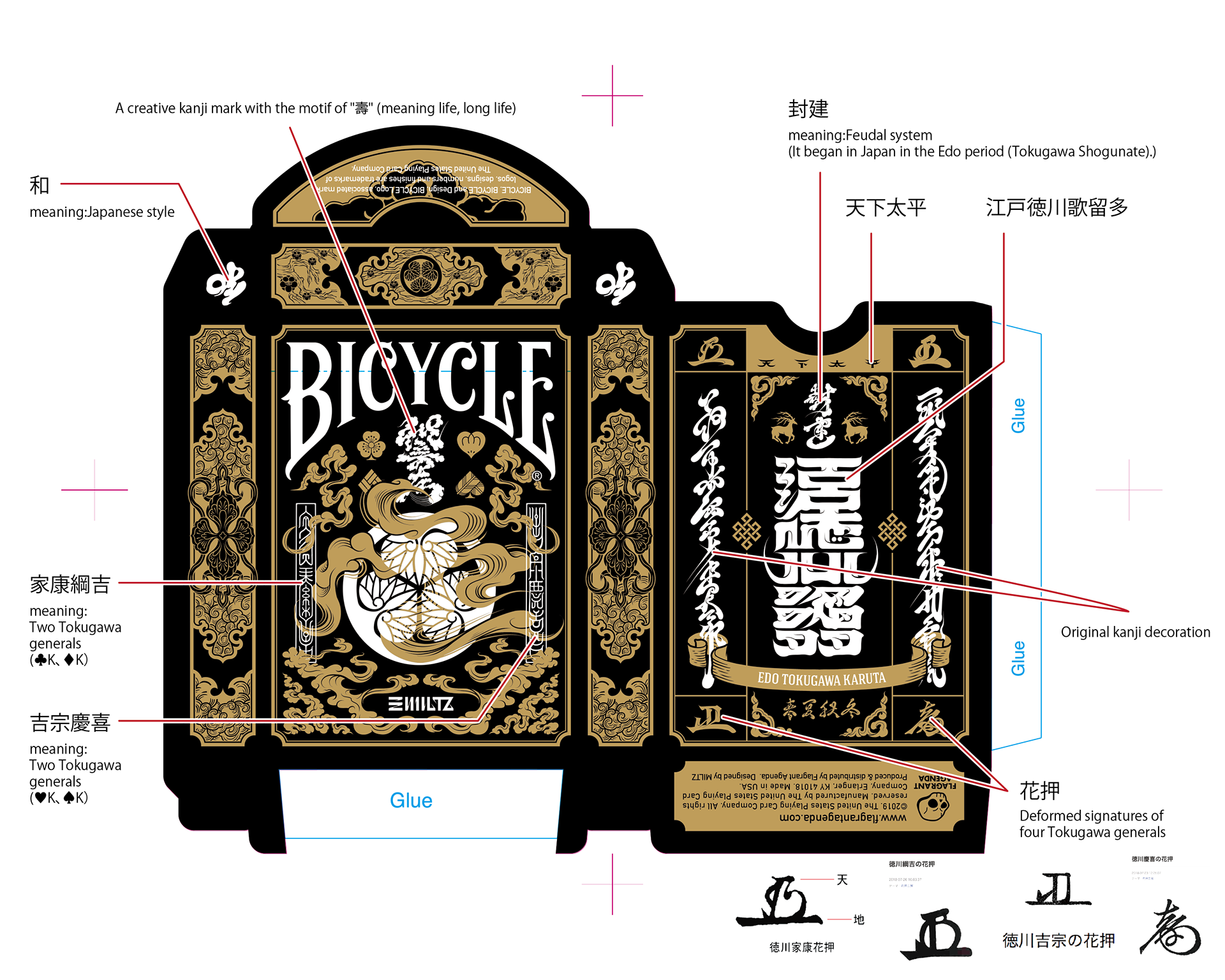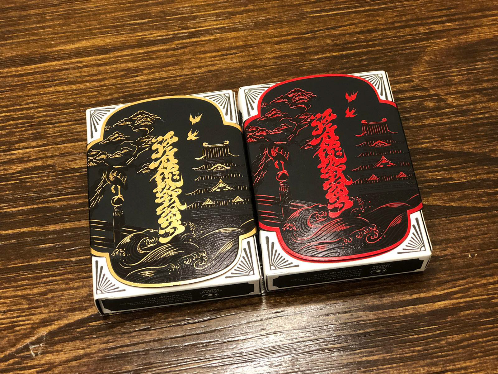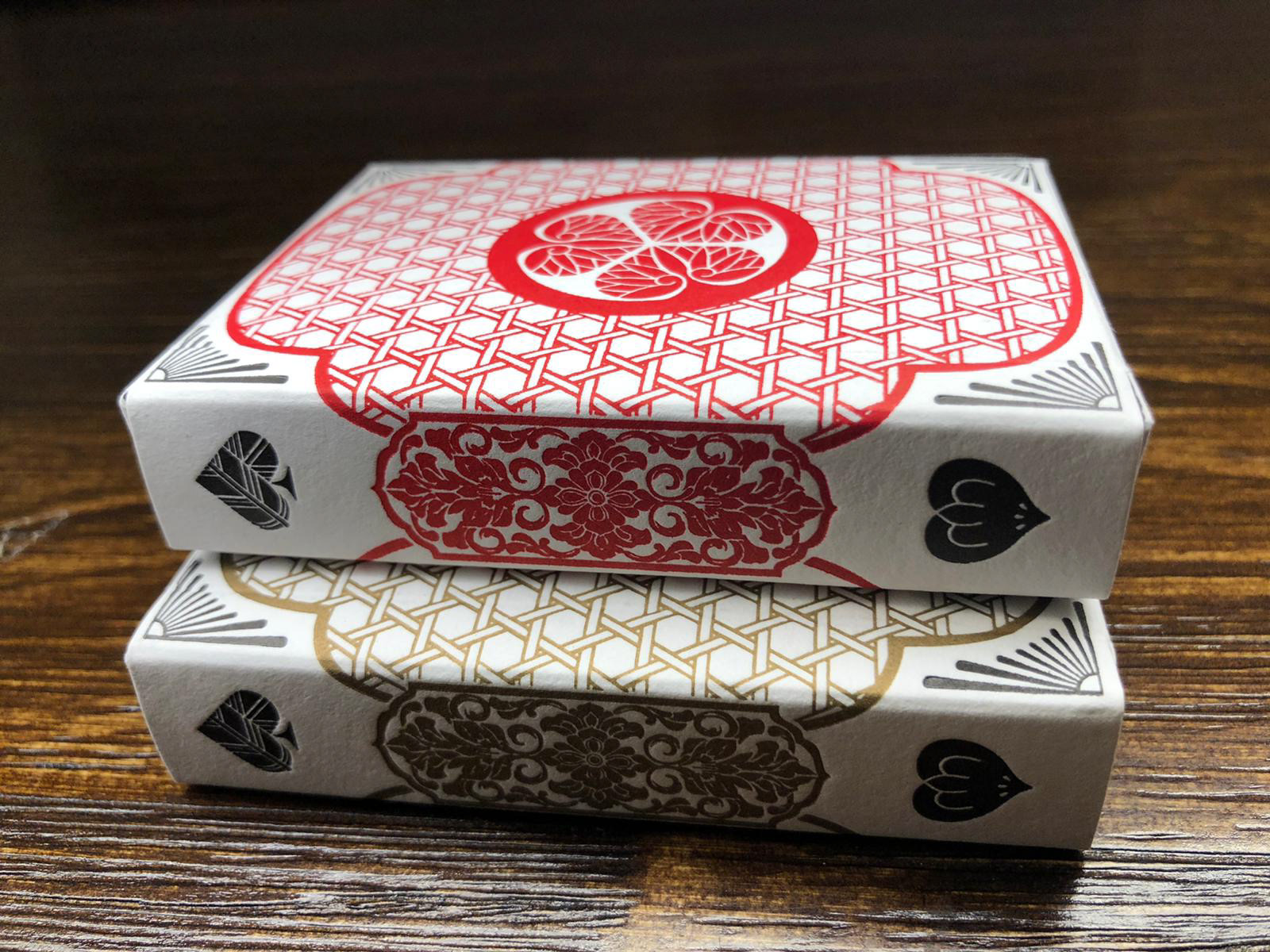 The Special Edition of both the Daimyo and Shogun decks includes a custom tuck case and deck sleeve. Since Edo Karuta's artwork covers every surface of the deck, the packaging has been redesigned to reveal the inner artwork without compromising its structural integrity. The tuck case opens from the front, with the middle section hollowed out to expose the card backs upon opening. As the cards are removed, the full inner artwork of the tuck case is gradually revealed.