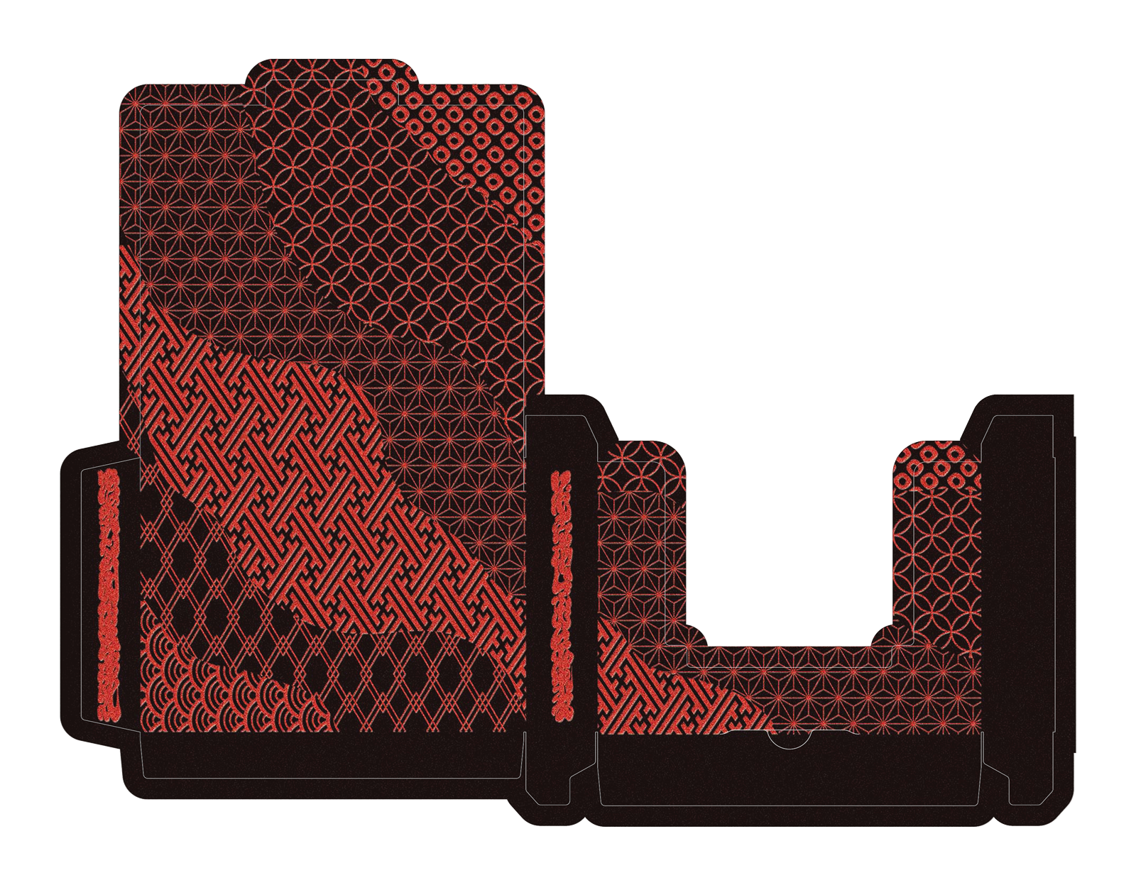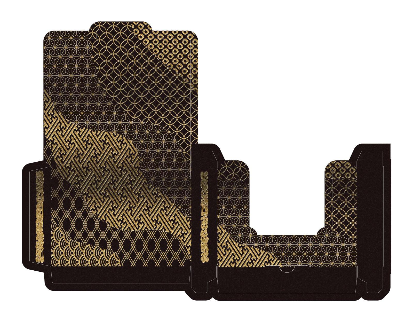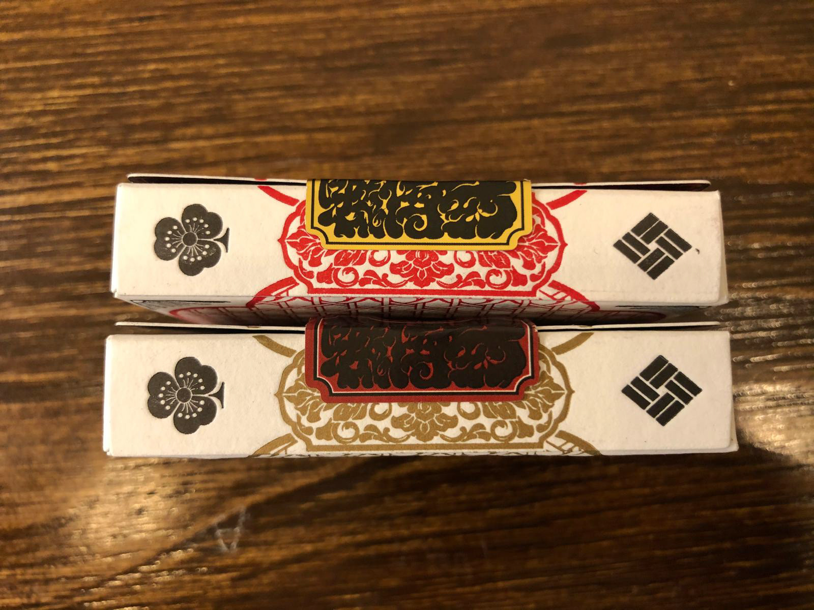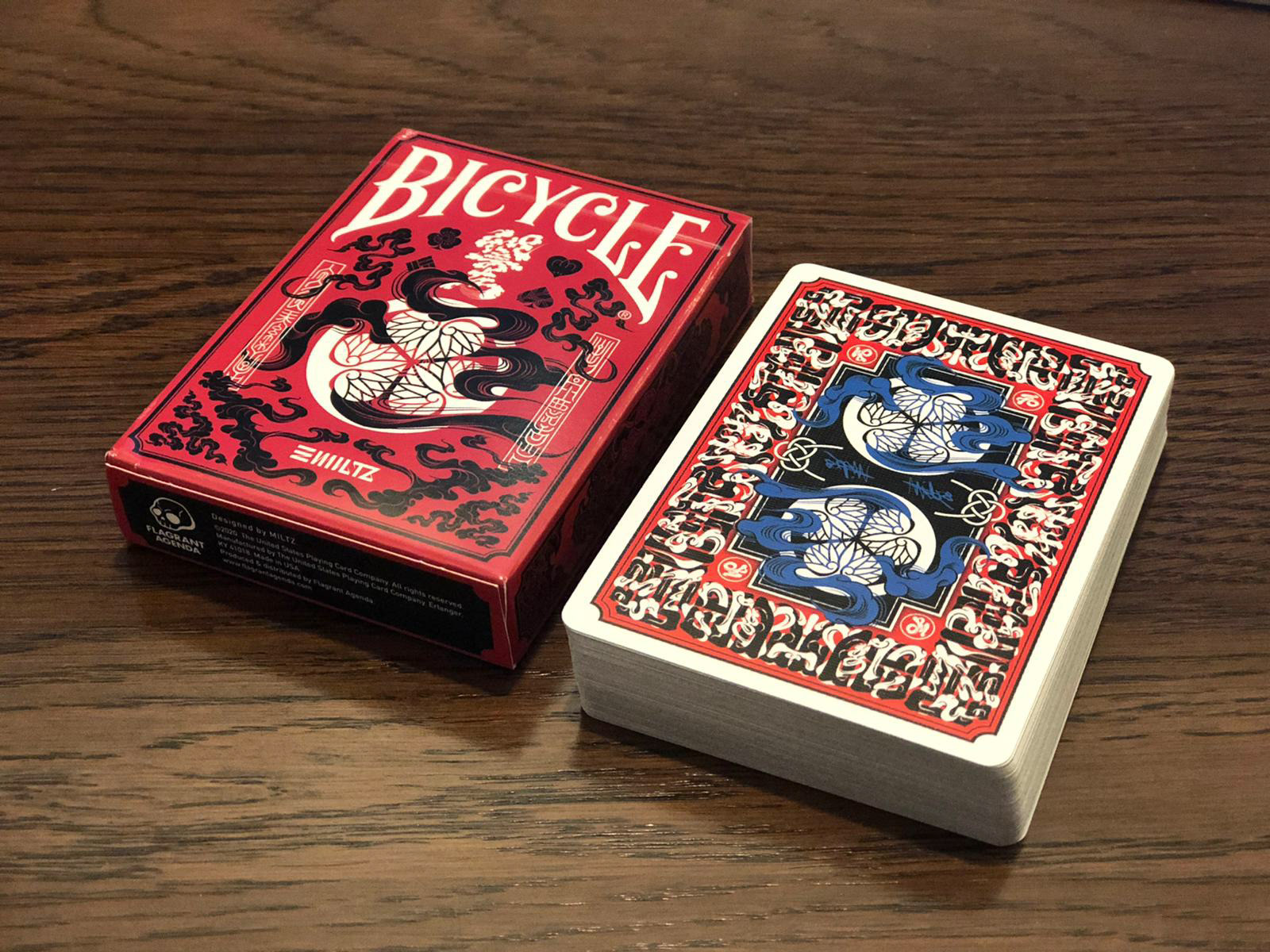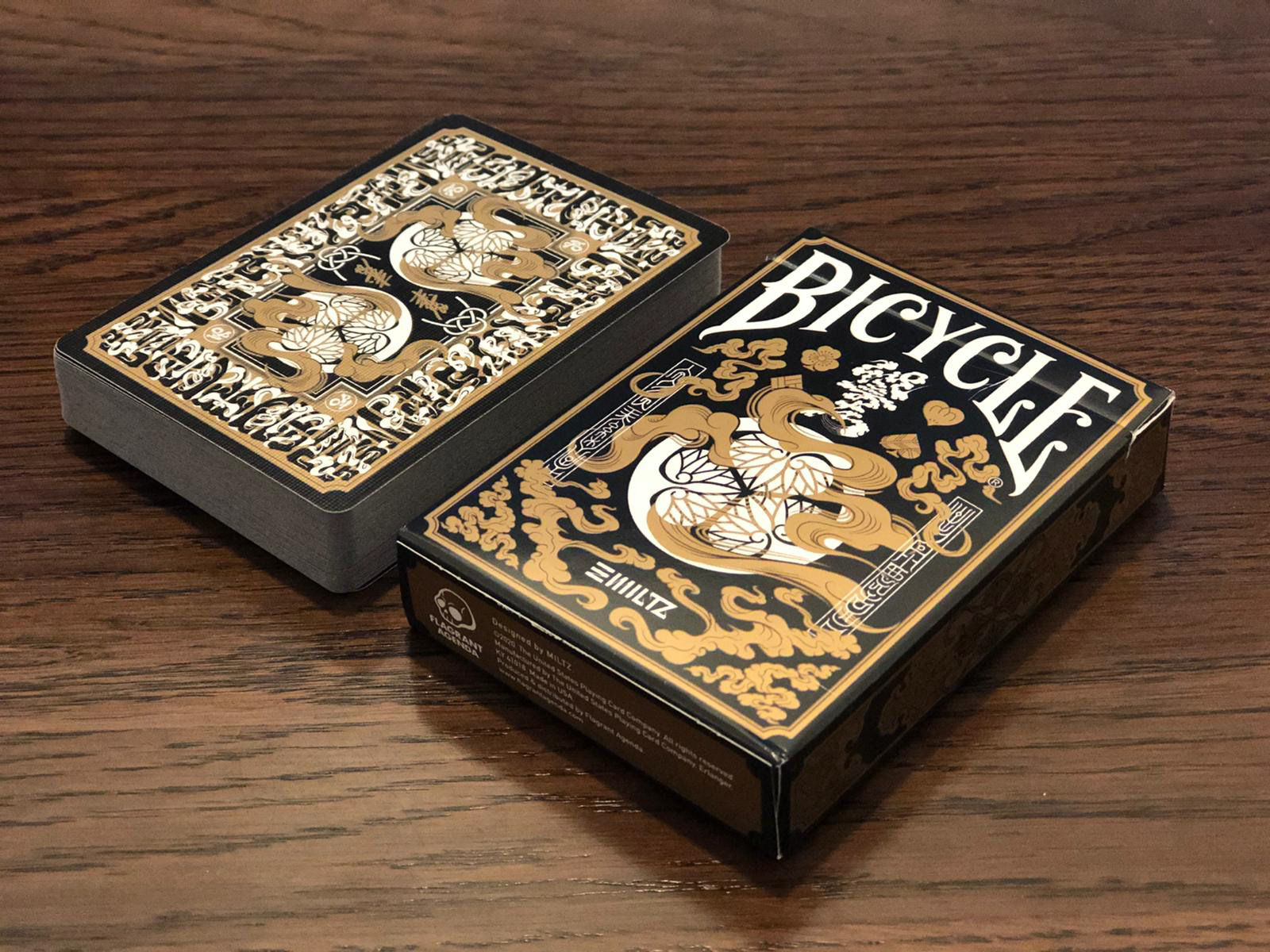 The Special Edition of both the Daimyo and Shogun decks includes a custom tuck case and deck sleeve. Since Edo Karuta's artwork covers every surface of the deck, the packaging has been redesigned to reveal the inner artwork without compromising its structural integrity. The tuck case opens from the front, with the middle section hollowed out to expose the card backs upon opening. As the cards are removed, the full inner artwork of the tuck case is gradually revealed.