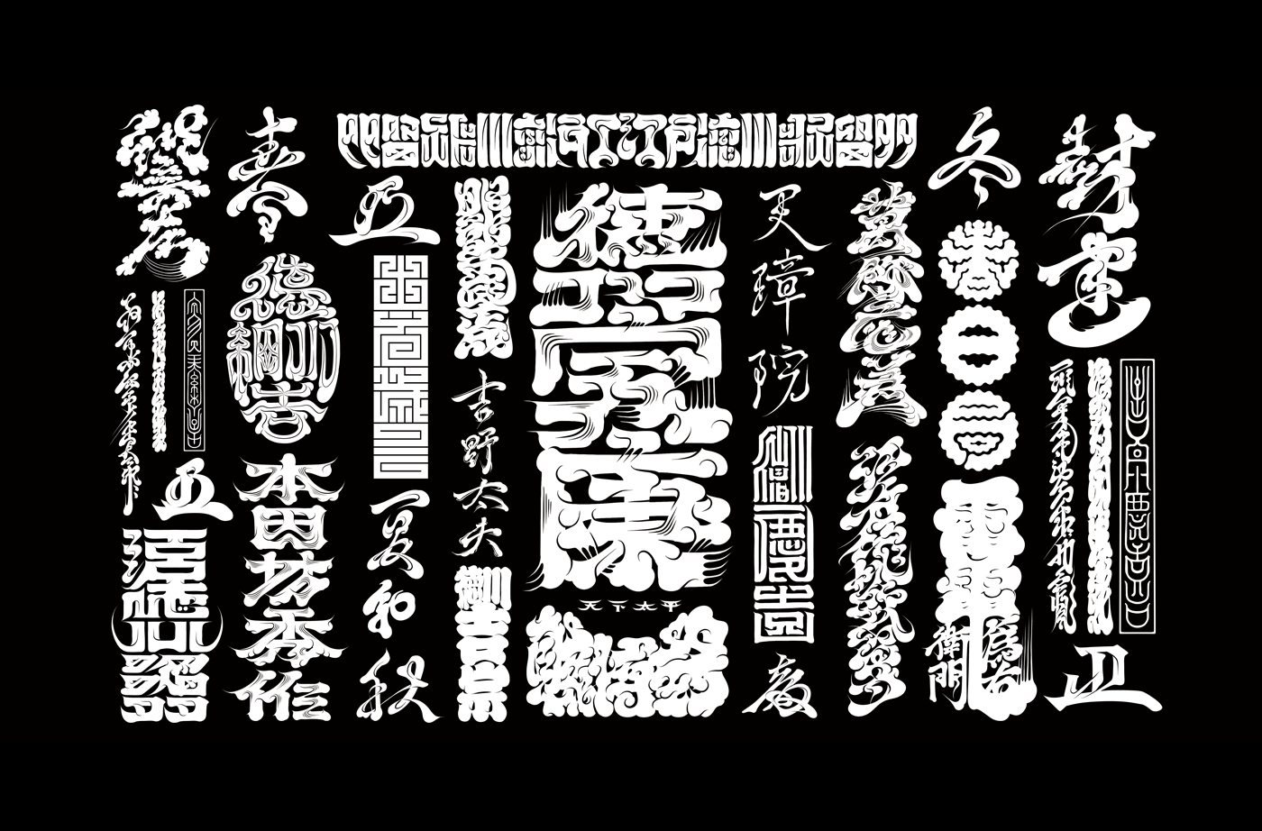 Traditional Edomoji forms the foundation, upon which original interpretations and arrangements are layered and expanded across a wide range of styles. Kabuki-moji, Kanteiryu, Kago-moji, Sumo-ji, Hige-moji, Kaku-ji, Kaō, Botan-moji, and Joryu-moji are thrown together without boundaries — constructing a singular, chaotic world of lettering that defies easy categorization.