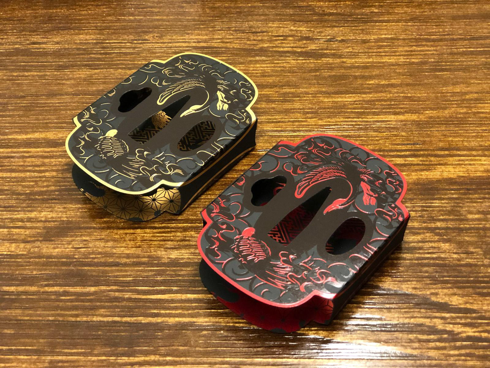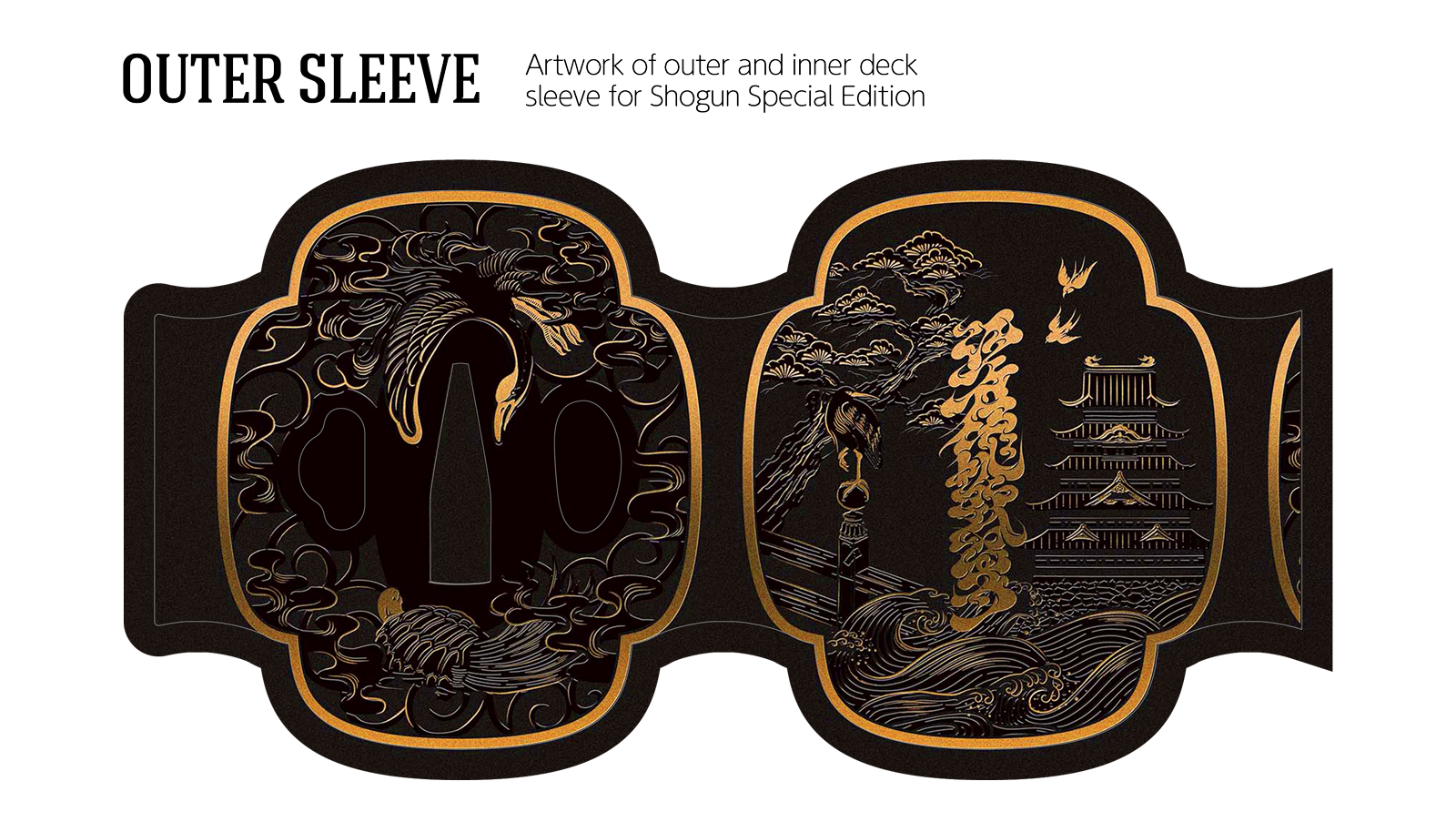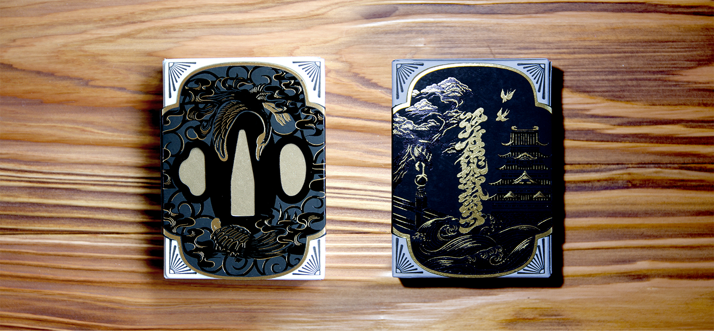 The premium case features lavish letterpress printing and foil stamping throughout. The outer case, modeled after a sword tsuba — the guard that sits between the blade and the handle — is adorned with the crane and tortoise, traditional symbols of longevity, representing the enduring legacy of the Edo period that spanned over two centuries.