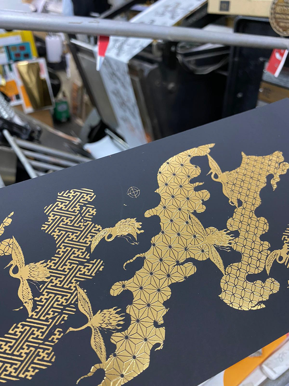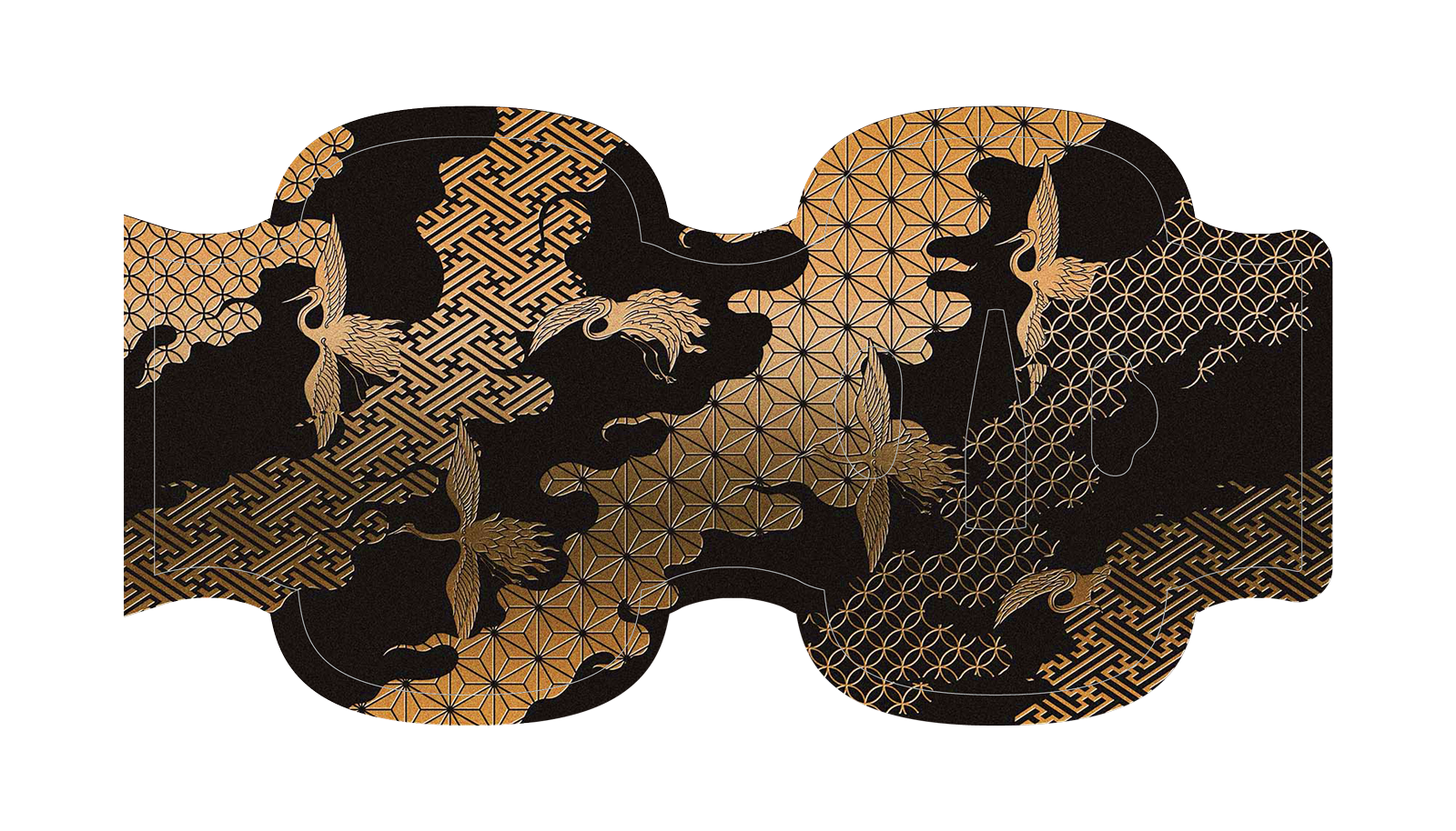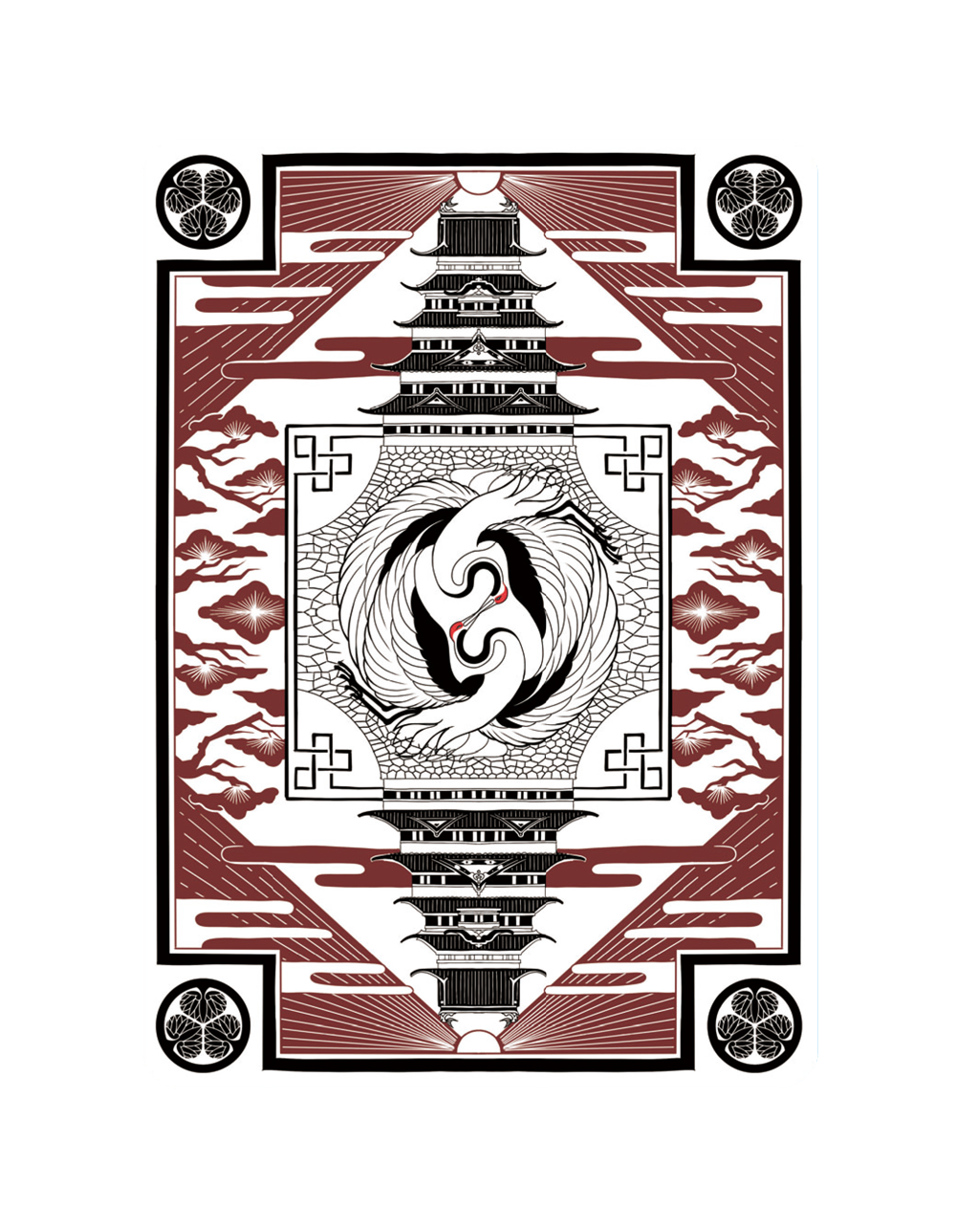 The premium case features lavish letterpress printing and foil stamping throughout. The outer case, modeled after a sword tsuba — the guard that sits between the blade and the handle — is adorned with the crane and tortoise, traditional symbols of longevity, representing the enduring legacy of the Edo period that spanned over two centuries.