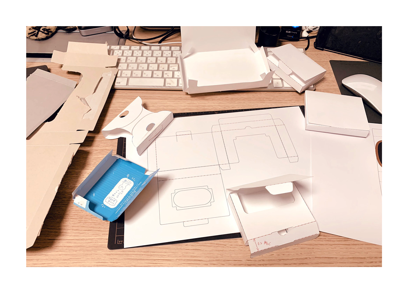 イメージに近い既製品のお菓子の箱を分解して展開図を取り出し、それをもとに構造を再構築した。まずはコピー用紙を使ってモックアップを作成し、形状と寸法を確認した。