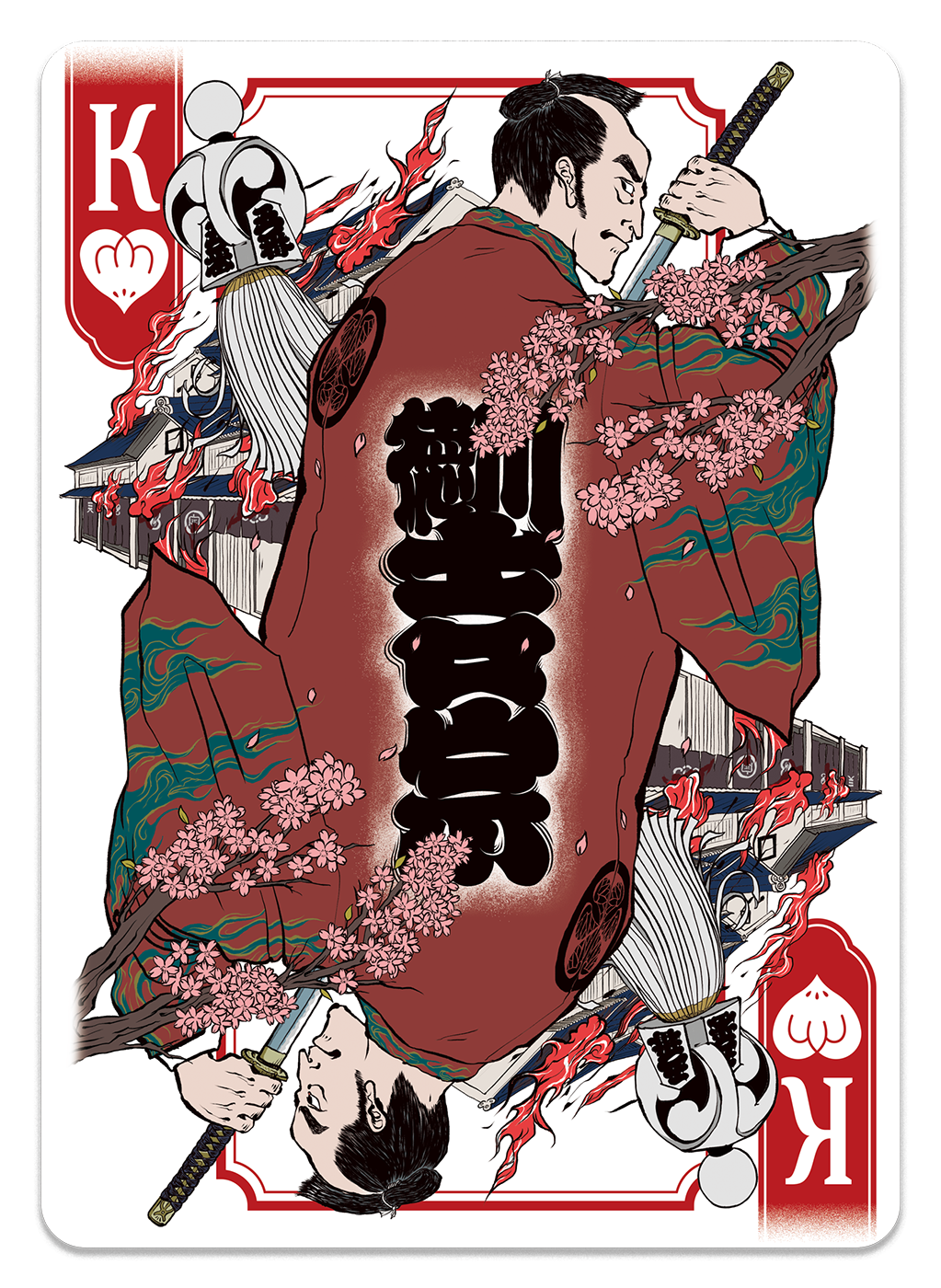 Known as the "Rebel Shogun," his cherry blossom tattoo has become his most iconic image. He was also the shogun who strengthened the firefighting infrastructure of Edo — a city of wooden buildings perpetually threatened by fire. The design draws its motifs from the fires of Edo and the tools of the firefighters who battled them.
