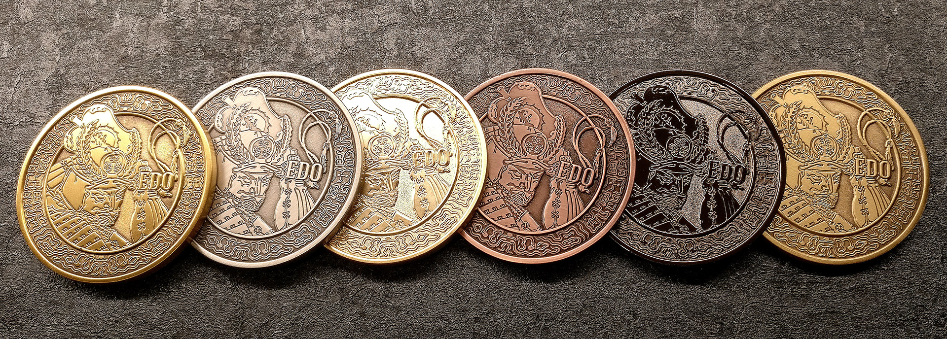「江戸かるた」の世界観に合わせた専用コインも制作しました。表面には徳川家康、裏面にはその家紋である葵紋を配し、デッキの象徴的なコレクターズアイテムとして仕上げています。