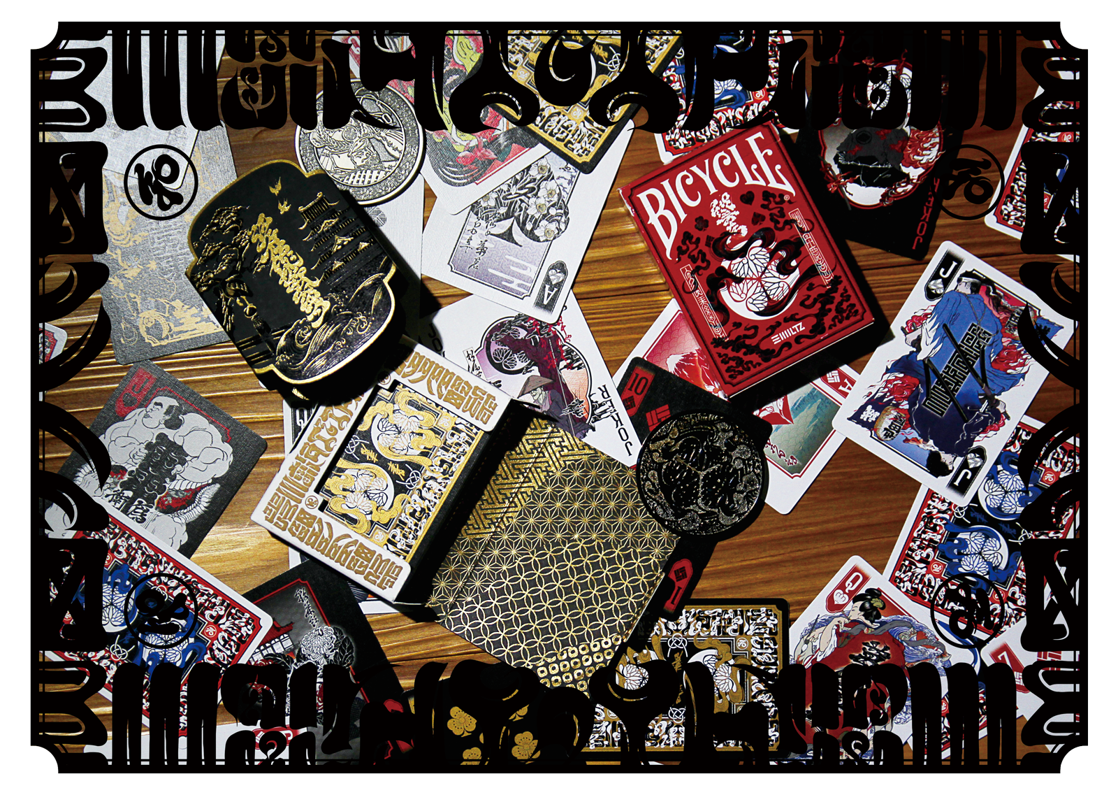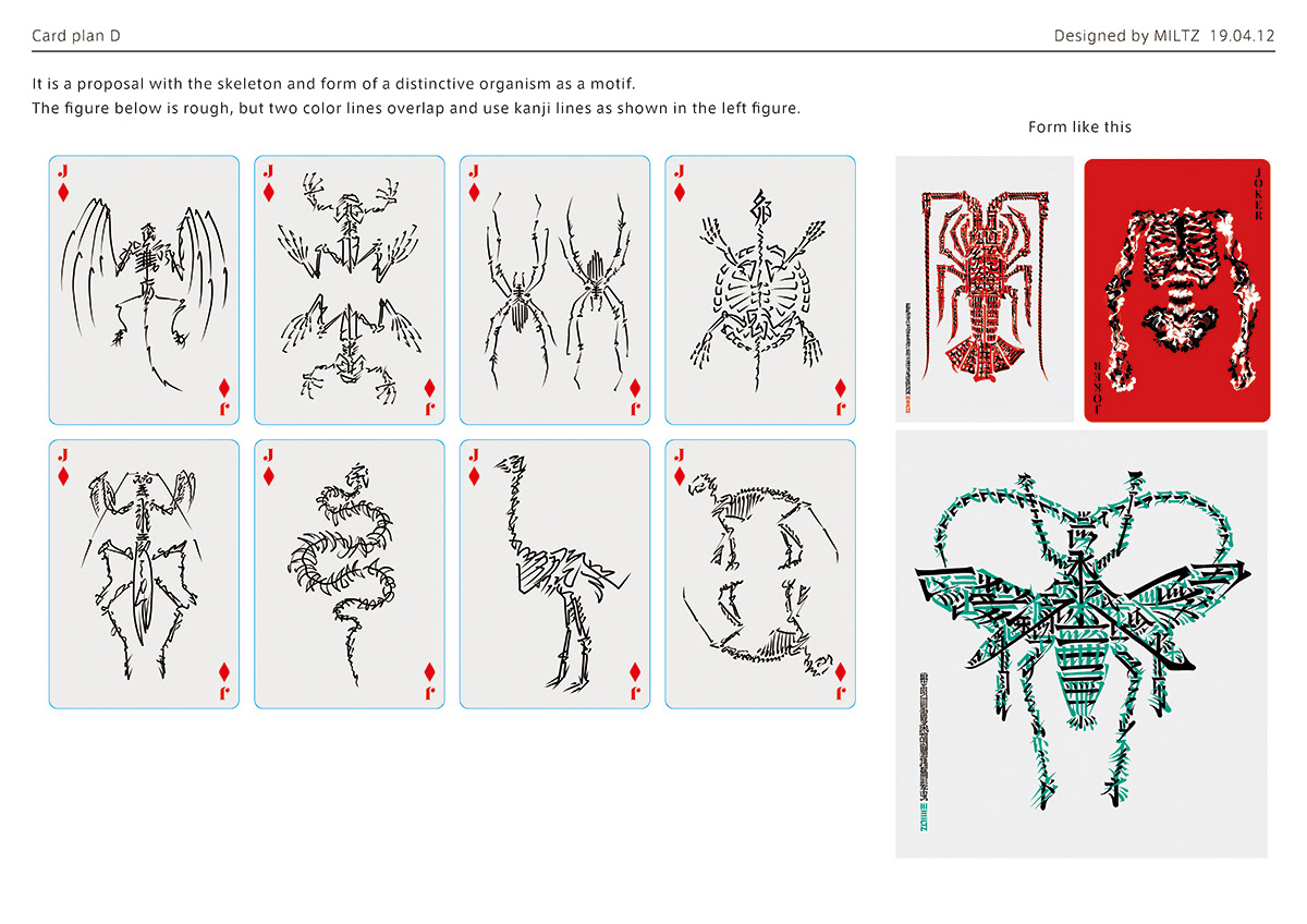 初期の構想段階では、私の表現の核であるレタリングアートを中心に思考を展開していった。トランプの歴史やスートが持つ象徴的な意味を掘り下げるうち、日本の文化的土壌との間に自然な接点を見出すようになった。その気づきが最初のコンセプトへと結実する。レタリングを刺青の表現言語へと昇華させ、歴史上の人物たちをその意匠で彩るというものだった。しかし制作の過程においてコンセプトは有機的に変容し、現在の形へと辿り着いた。