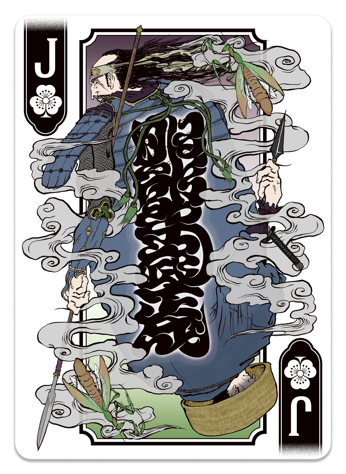 いわゆる「忍者」の代名詞的存在。創作の世界では黒装束のイメージが定着しているが、実在の忍者は普段、農民や薬売りに扮して身分を隠していたと言われている。戦場での勇猛な姿と、世に紛れ込む市井の姿、その対比をイラストレーションに込めた。