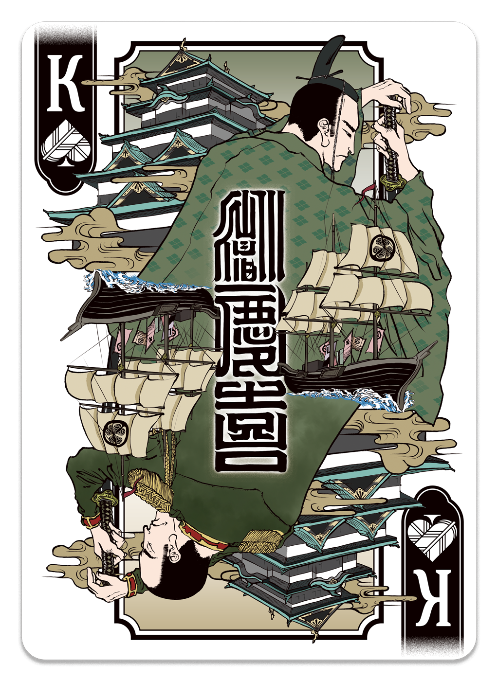 The last shogun of the Edo period. He is portrayed as a man tormented by the fate of Japan, caught between the forces of the imperial restoration and mounting foreign pressure. The illustration places the already-lost Edo Castle against a ship bound for foreign shores, with traditional Japanese robes set against a Western military uniform — a composition built to embody the end of an era.