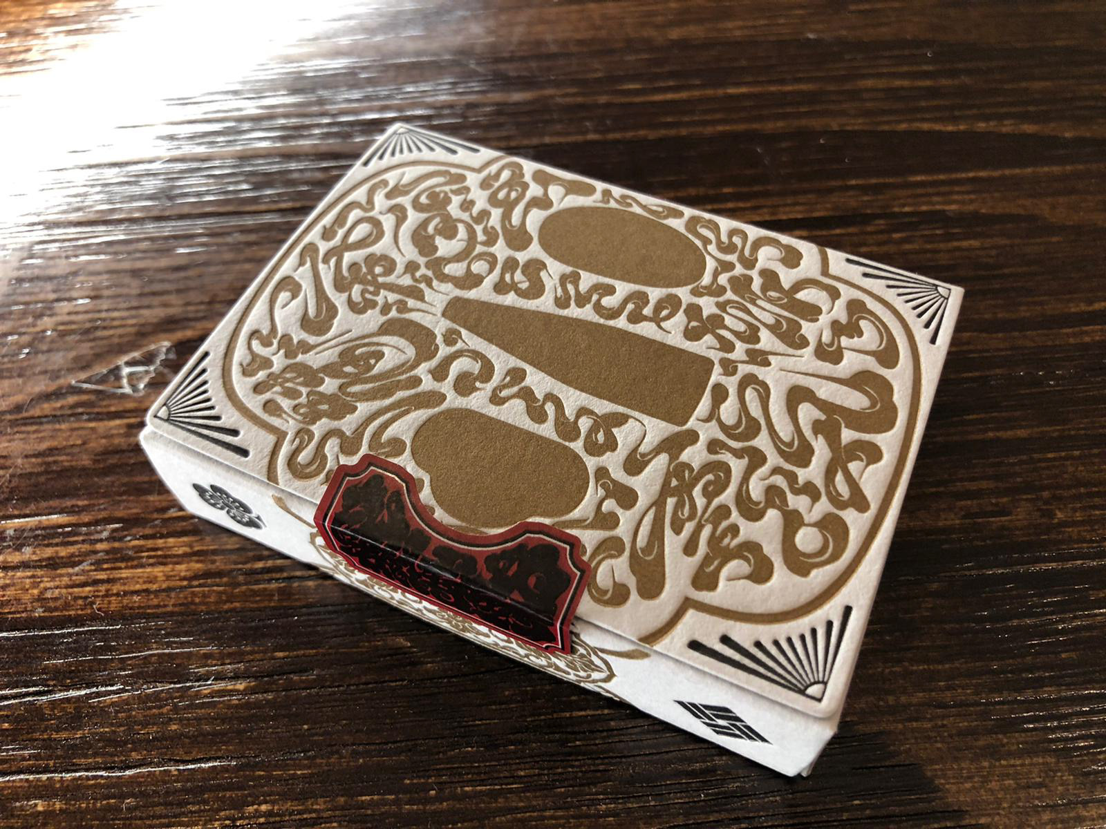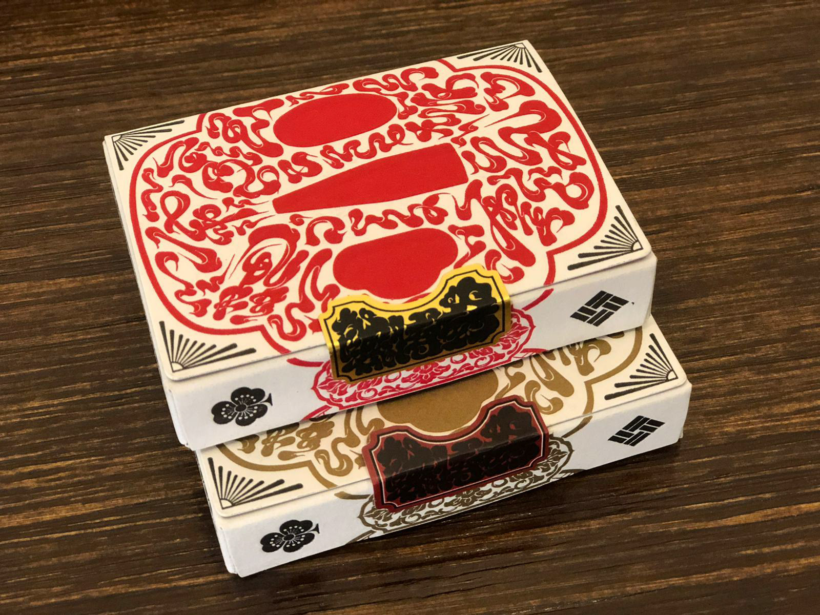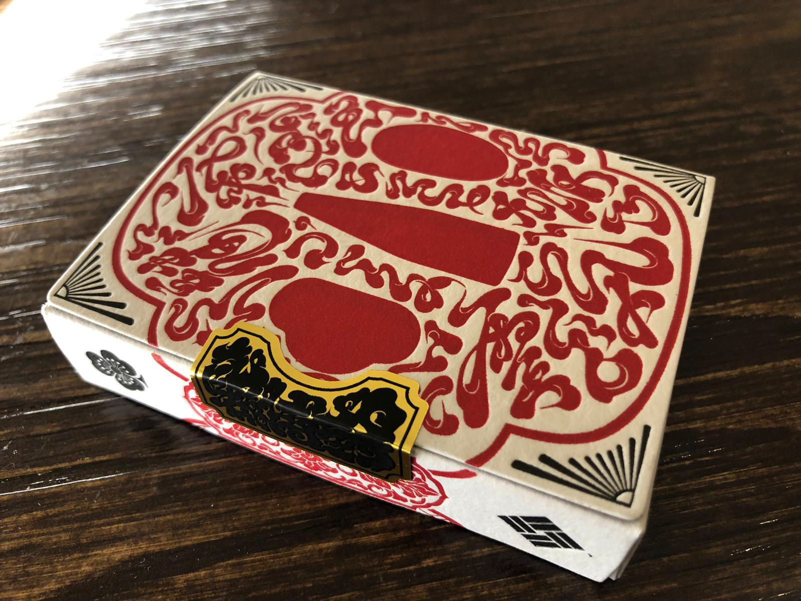 インナーボックスの蓋は「賭博封」と記されたシールで留められています。江戸時代、賭博は幕府によって厳しく禁じられており、このシールはその時代の空気をデザインに忍ばせた遊び心のある演出です。また、デッキのバックグラフィックが箱の切れ込みにぴったりと収まるよう設計されています。
