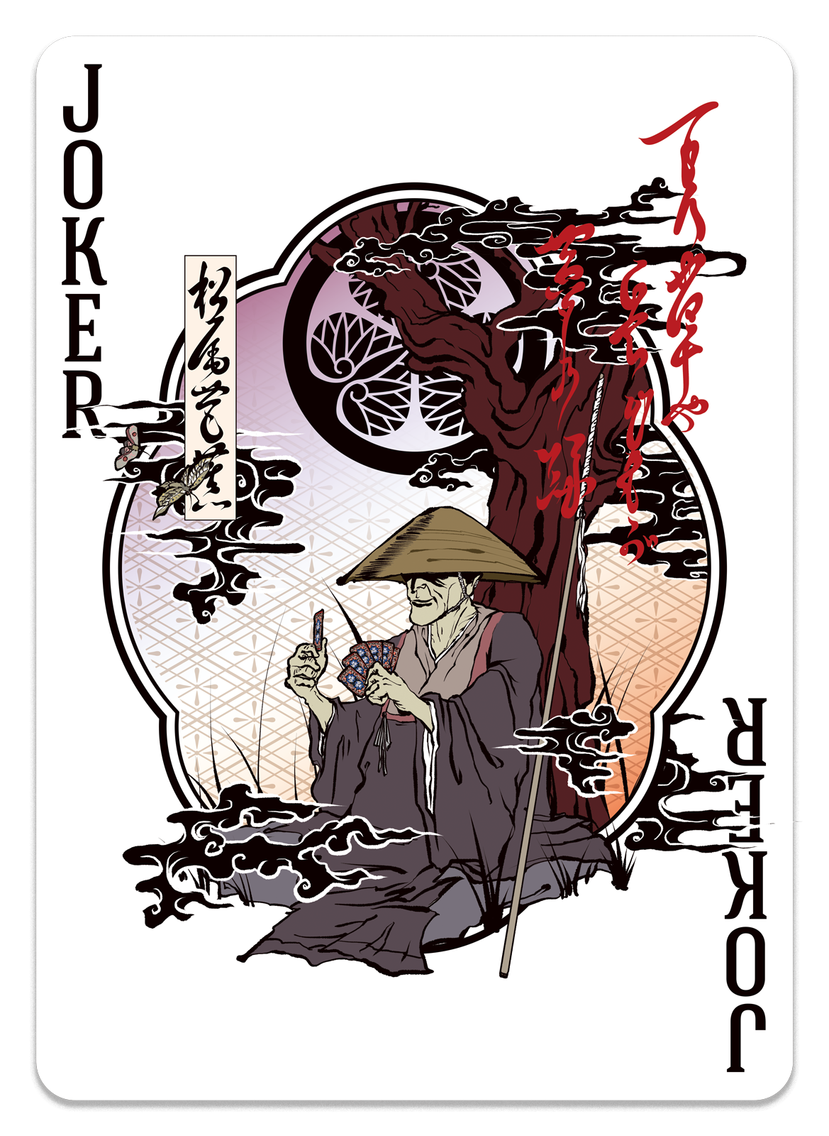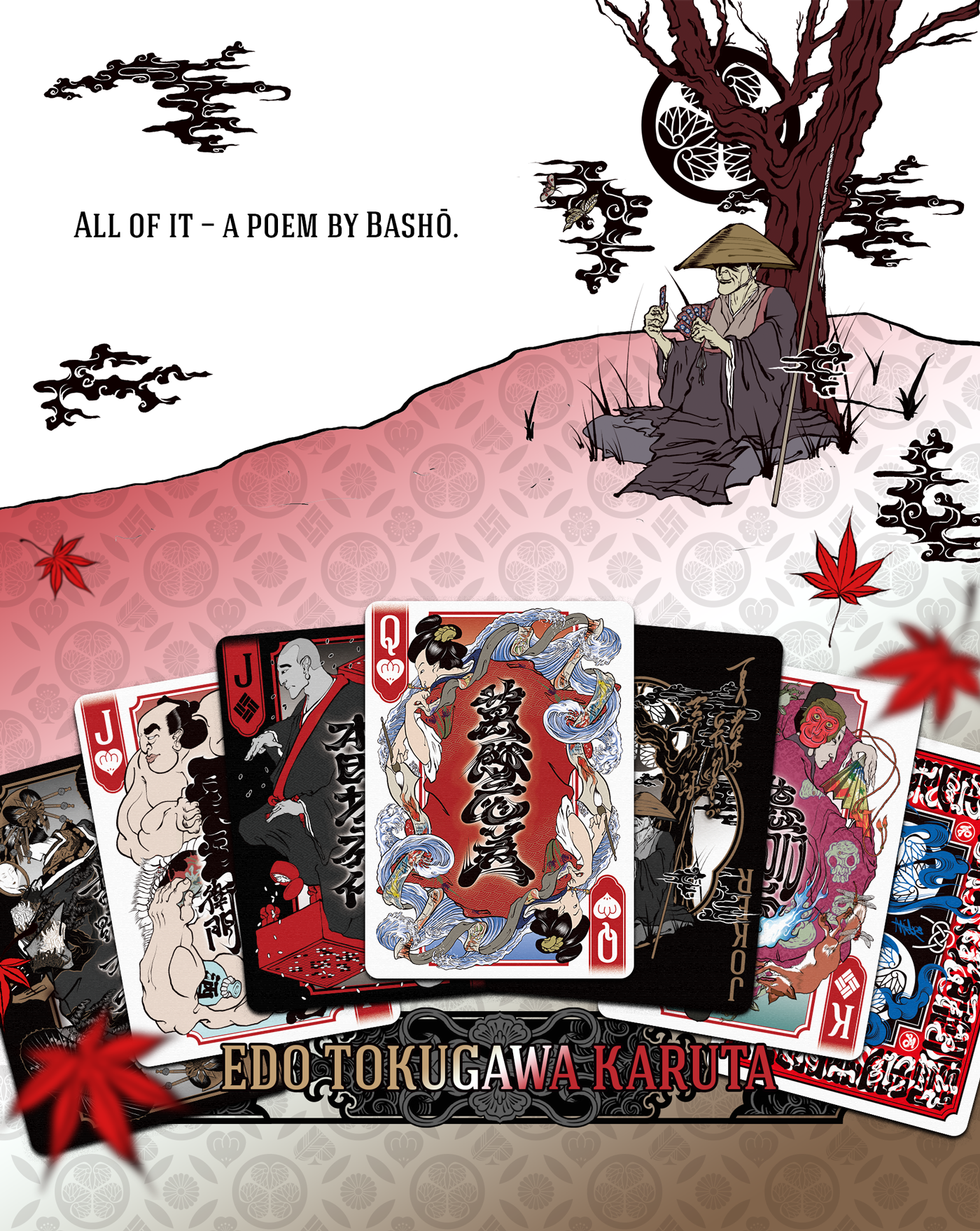このプレイングカードの世界観はすべて、松尾芭蕉が見て・詠んだ景色という設定のもとに成り立っています。詩人として各地を旅した芭蕉ですが、一説にはその旅の裏に諜報活動があったとも言われています。このデッキの中で彼は、その任務の合間に木に寄り添い休息をとりながら、静かにこのトランプを眺めています。