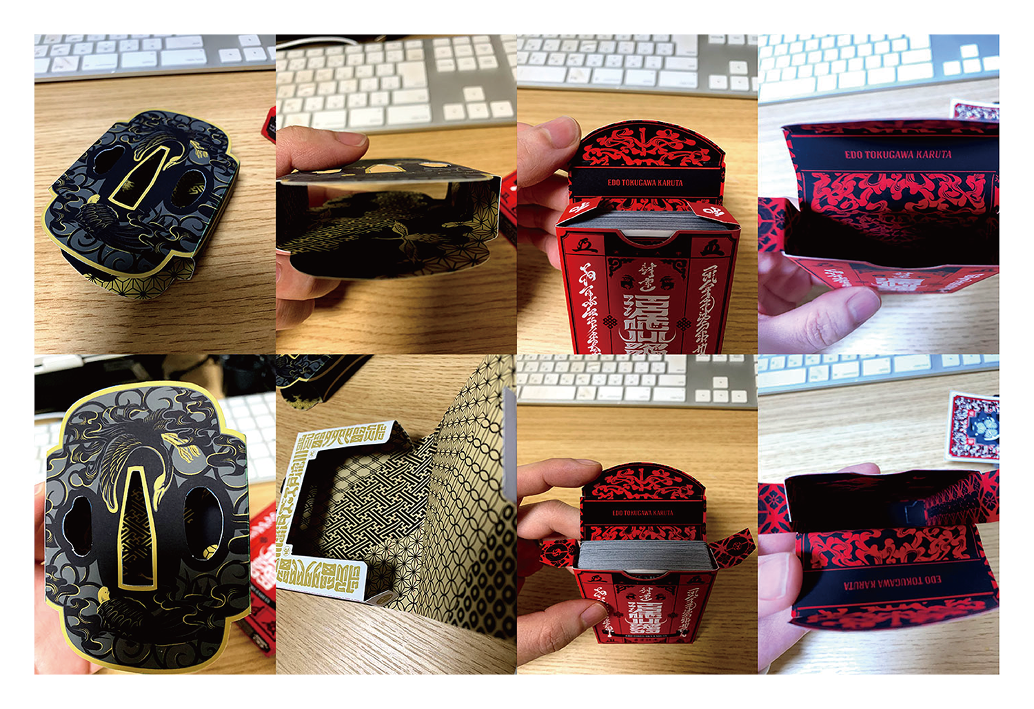 大名版・将軍版のスペシャルエディションには、専用タックケースとデッキスリーブが付属する。デッキ全面にアートワークが施された「江戸かるた」の特性を活かすため、開封と同時に内側のアートワークが見える構造を採用した。ケース中央部は開口しており、開けた瞬間にカードの裏面が現れる。カードを取り出すにつれ、内側のアートワークが全て姿を現す仕組みだ。